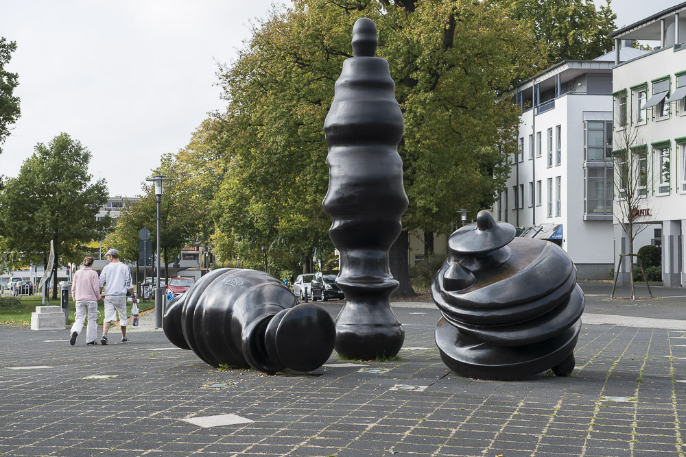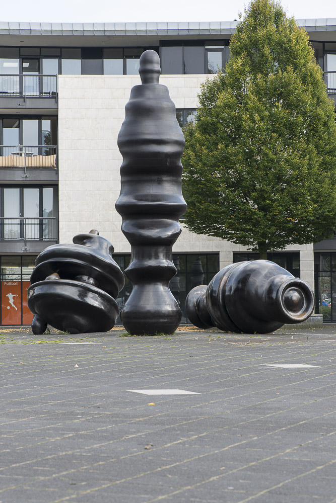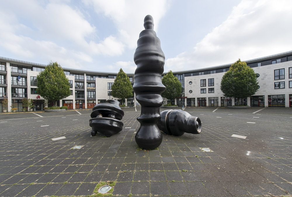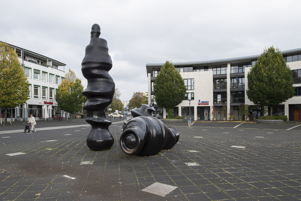 The bronze sculpture On the Glade comprises three parts that appear to be randomly arranged in the middle of the square without a pedestal. One of the shapes stands upright and is reminiscent of a soft clay vase with irregular curves. Lying beside it on the ground, the second object is almost spindle-shaped. The third form stands at an angle and also features irregular curvature, but looks a bit more compacted and compressed.