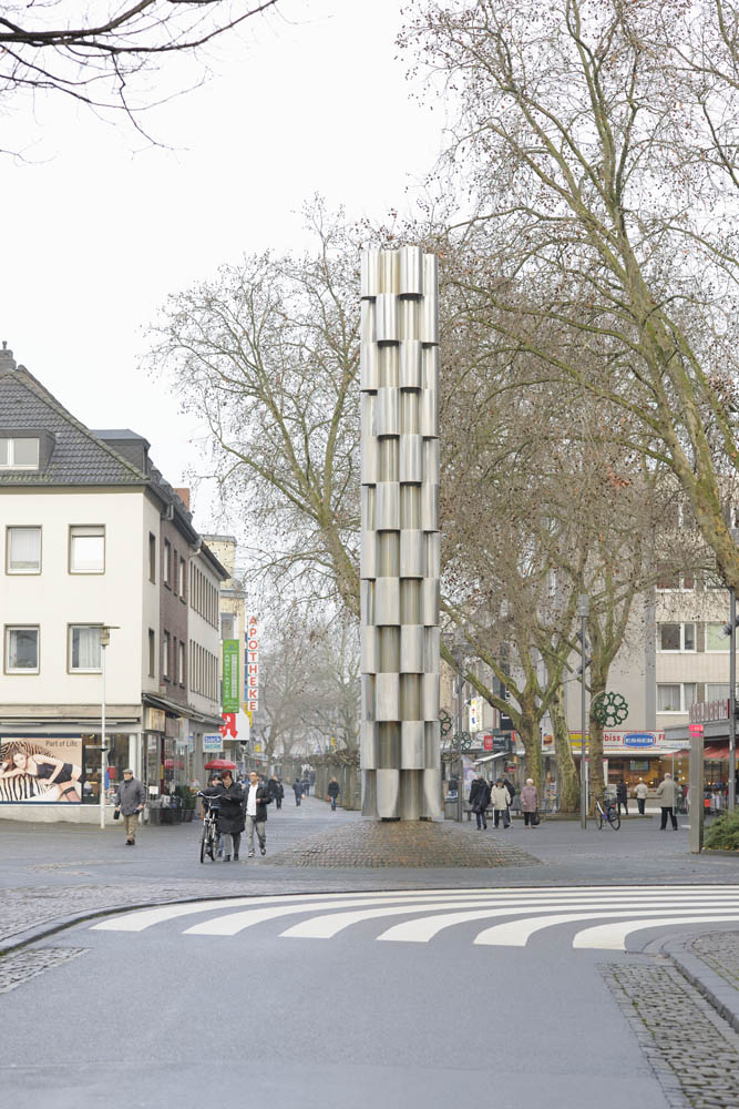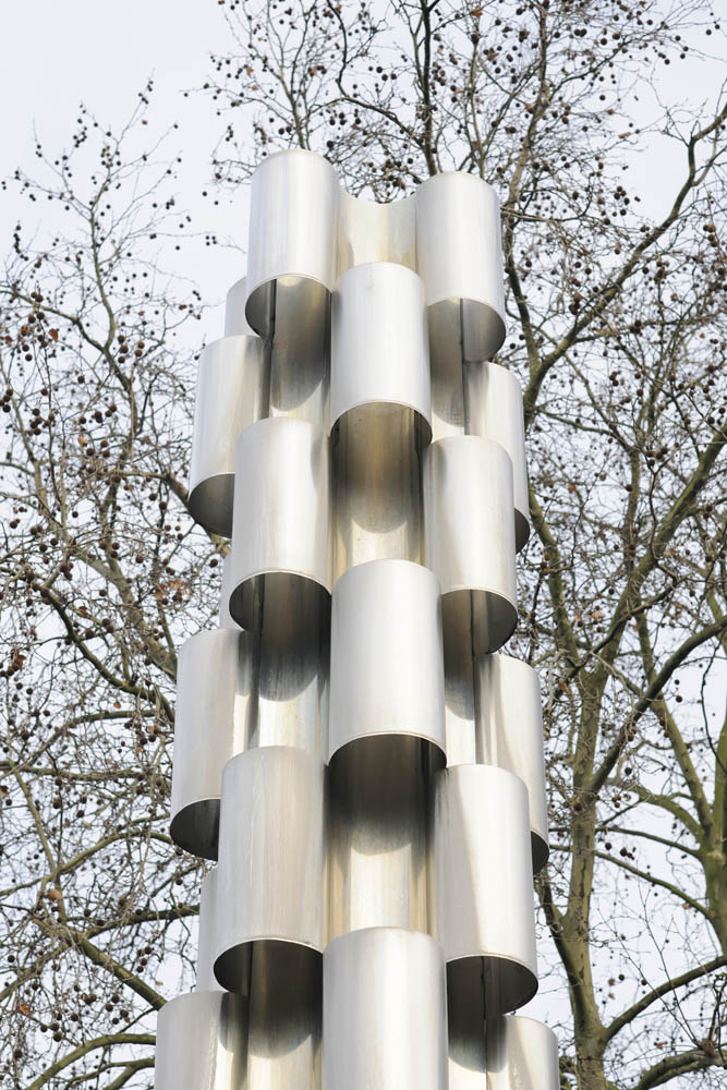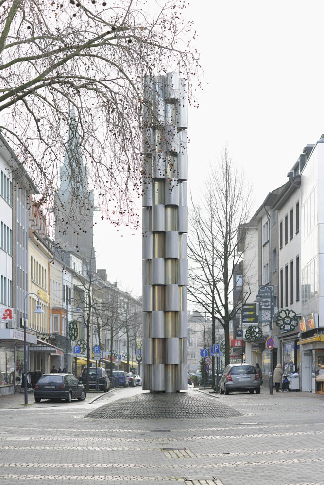 The object is designed as a vertical counterpoint to the more horizontal structure of the nearby Stadtsparkasse building. The bands that run lengthwise along the facade are echoed in the sculpture’s convex and concave bands, which were stacked to form a vertical column. When water flows through the concave elements, it creates the illusion that the dry convex elements are slowly moving upwards.