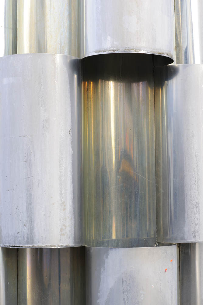 This freestanding column consists of 12 levels of stacked open and closed cylindrical modules. Water flows through the pipe segments from the top of the column to the base, which is a paved dome-shaped area on the ground.