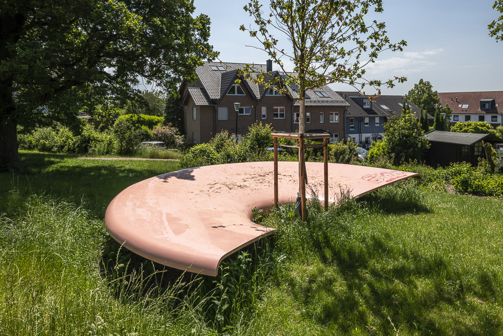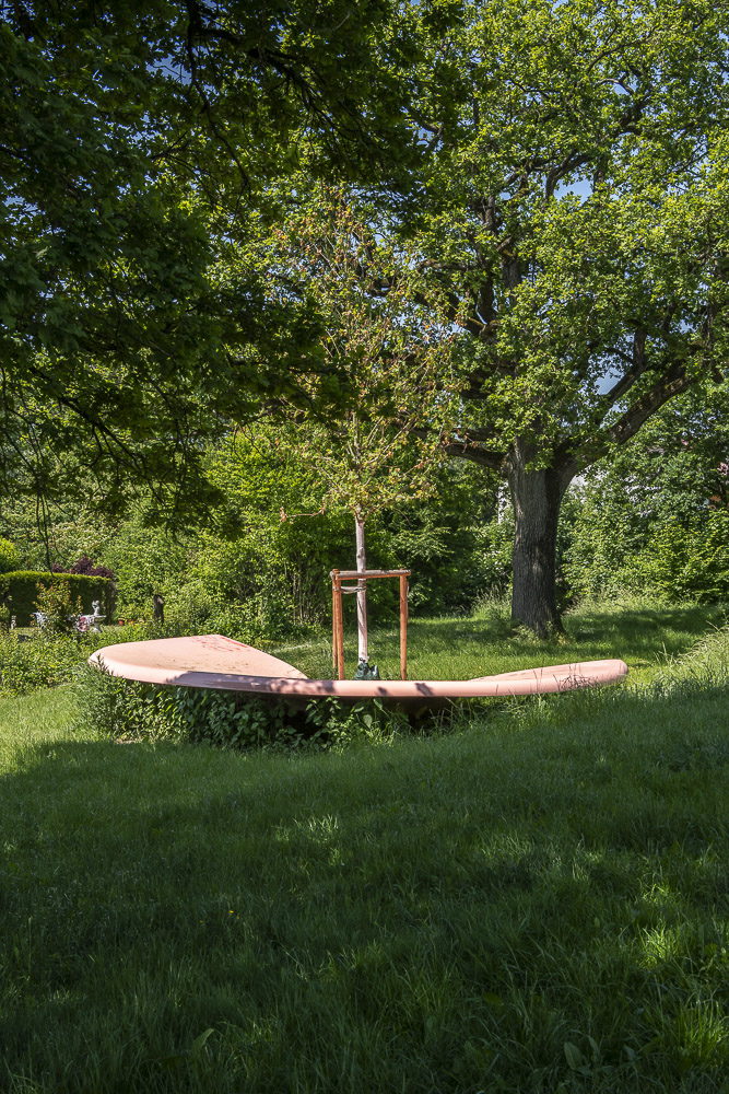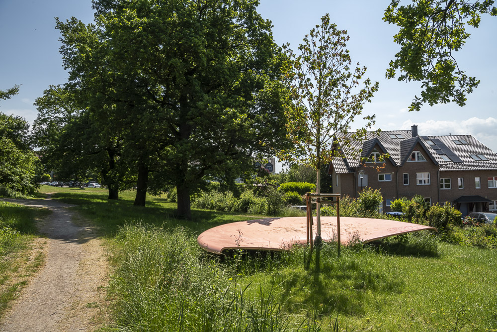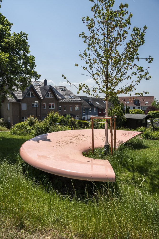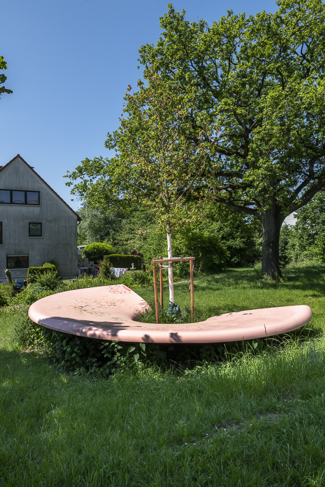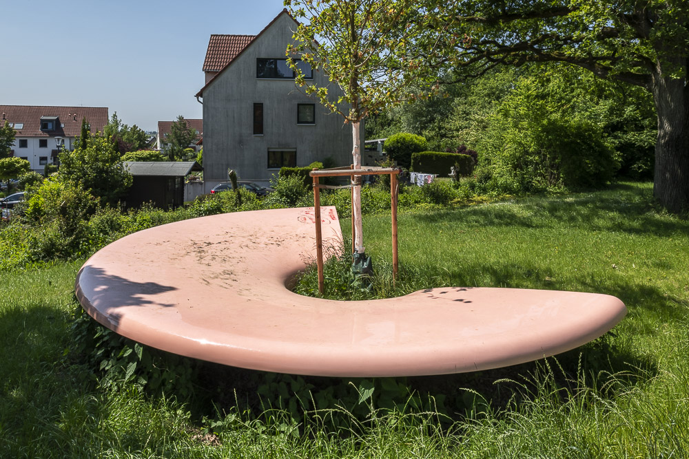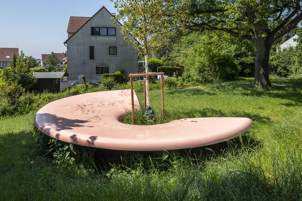 Die 2003 installierte Baumscheibe von Ute Reeh lud dazu ein, den Körper und die eigene Wahrnehmung in direkten Kontakt mit dem Kunstwerk, mit dem Umraum und mit der Natur zu bringen. Indem man sich auf den großen, sanft geschwungenen Teller der Skulptur legte, wozu das ausgesparte Drittel einen bequemen Einstieg bot, schweifte der Blick über den Stamm in das verzweigte Astwerk des alten Baumes. Während die Skulptur bis zu ihrer Sanierung den Stamm einer Eiche umfasste, wurde sie 2022 aus Sicherheitsgründen in einigem Abstand zu diesem Baum aufgestellt. Ein junger Baum, dessen Wachstum nun verfolgt werden kann, wurde in den Mittelpunkt der Baumscheibe gepflanzt. Während der Aspekt der Baumbetrachtung zwangsläufig so etwas in den Hintergrund gerückt ist, tritt der skulpturale Charakter der Baumscheibe mehr in den Vordergund. In ihrer poppigen Fleischfarbigkeit erinnert sie selbst an ein Gewächs, einen Baumpilz etwa. Auch die Betrachtung des Himmels und der Wolken lässt die Verbundenheit zu Umraum und Umwelt spürbar werden.