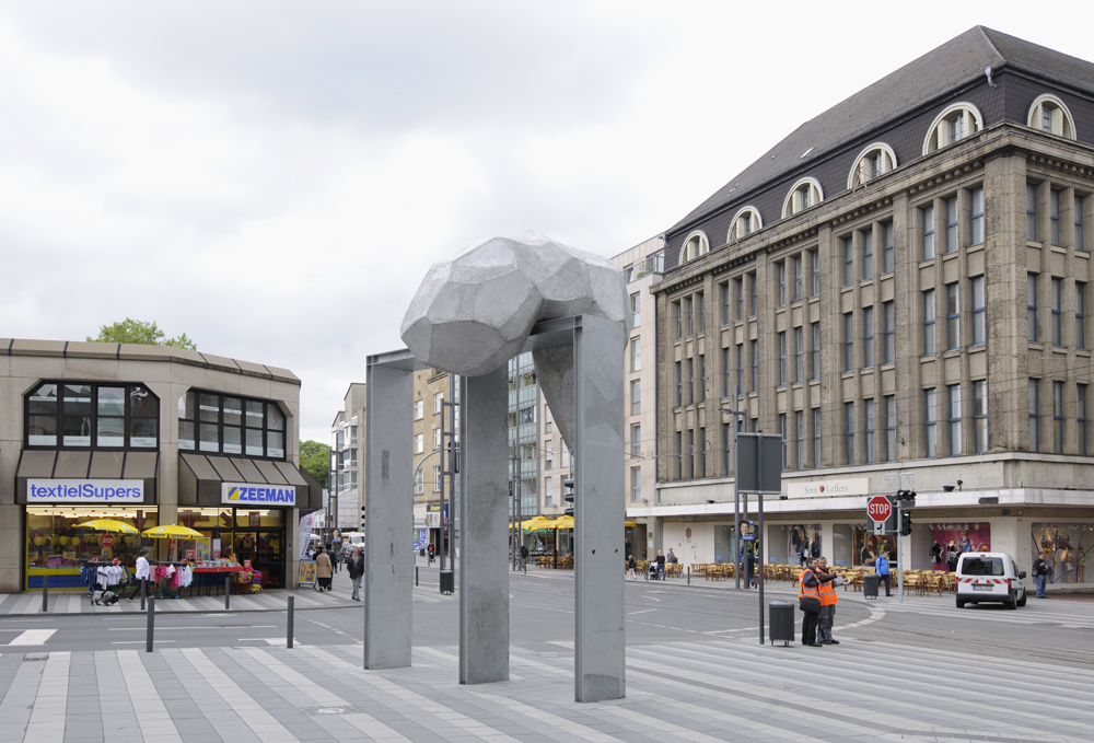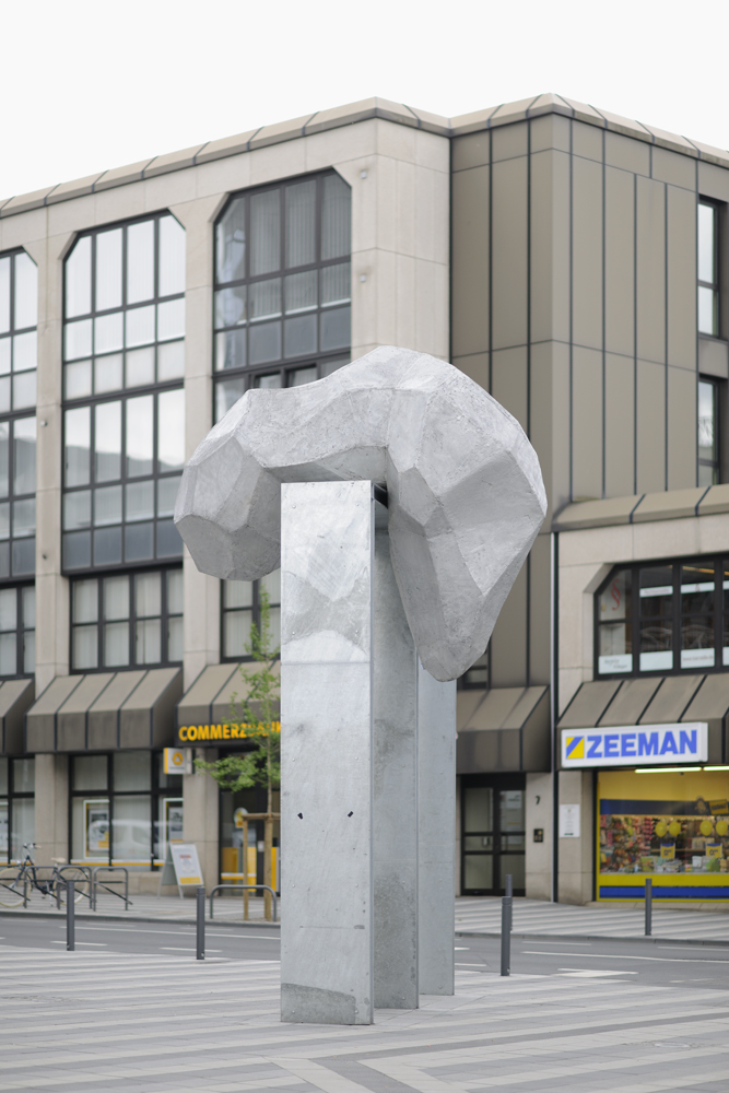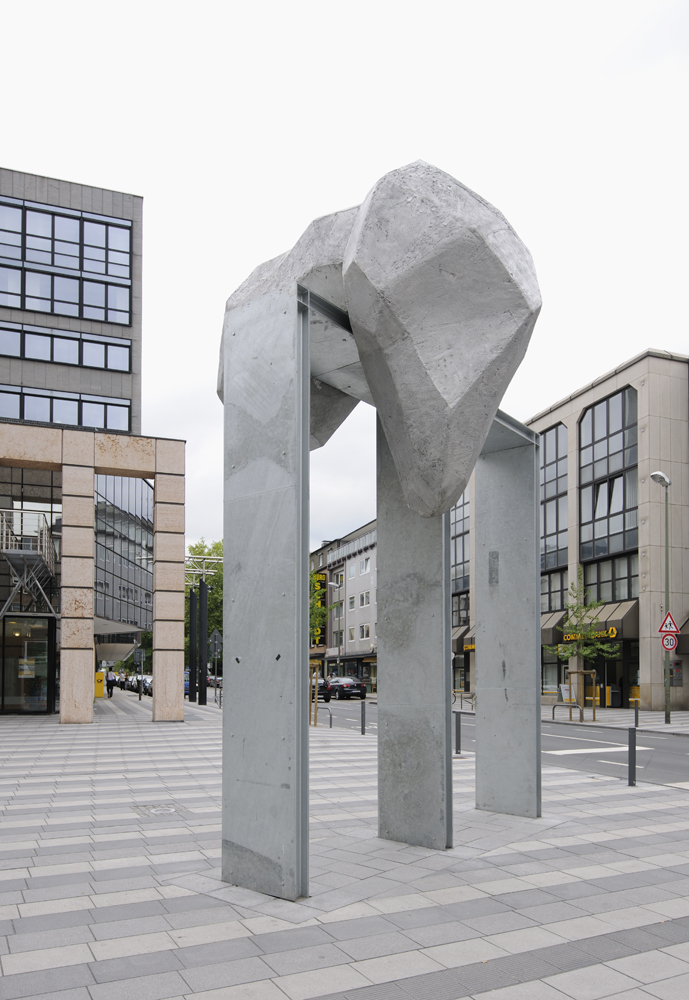 Ein großes rechtwinkliges „M“ aus Stahlträgern, das wie die Kreuzung aus einem Triumphbogen mit dem Logo einer großen Fast-Food-Kette aussieht, ist bekrönt von einem merkwürdigen Gebilde: Amorph und doch geometrisch aus prismenförmigen Flächen zusammengesetzt hängt es schlapp über einer Hälfte des oberen waagerechten Stahlträgers. Den einen erinnert es an einen ausgespuckten Kaugummi, den anderen an eine beinlose Ameise, zahllose Assoziationen sind möglich, doch bleibt die Skulptur undefinierbar und fremd.