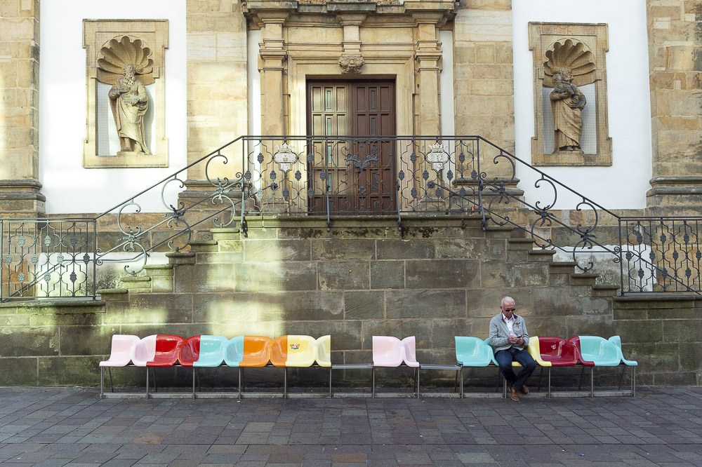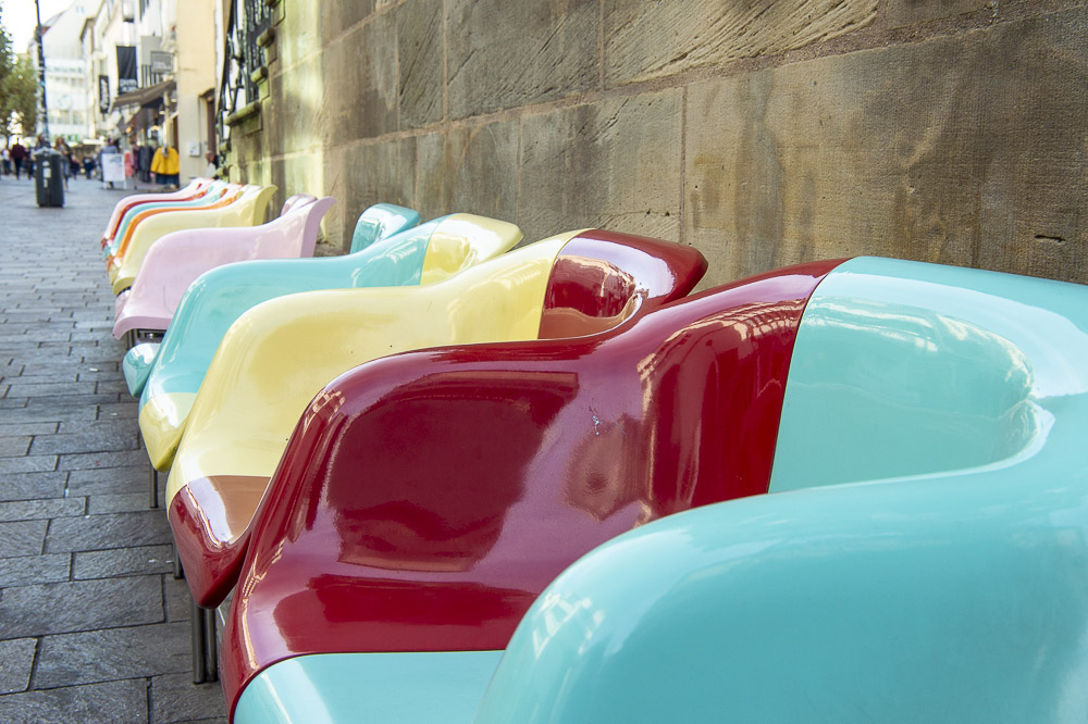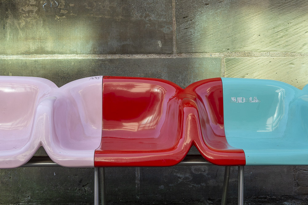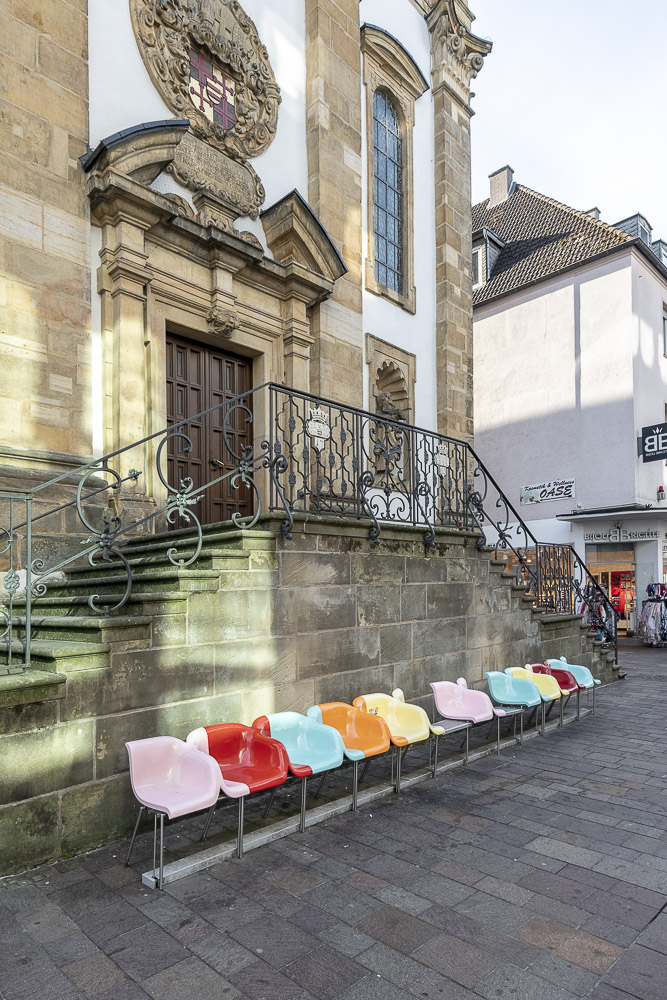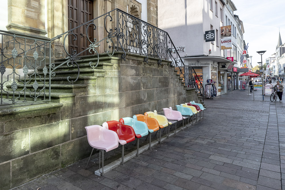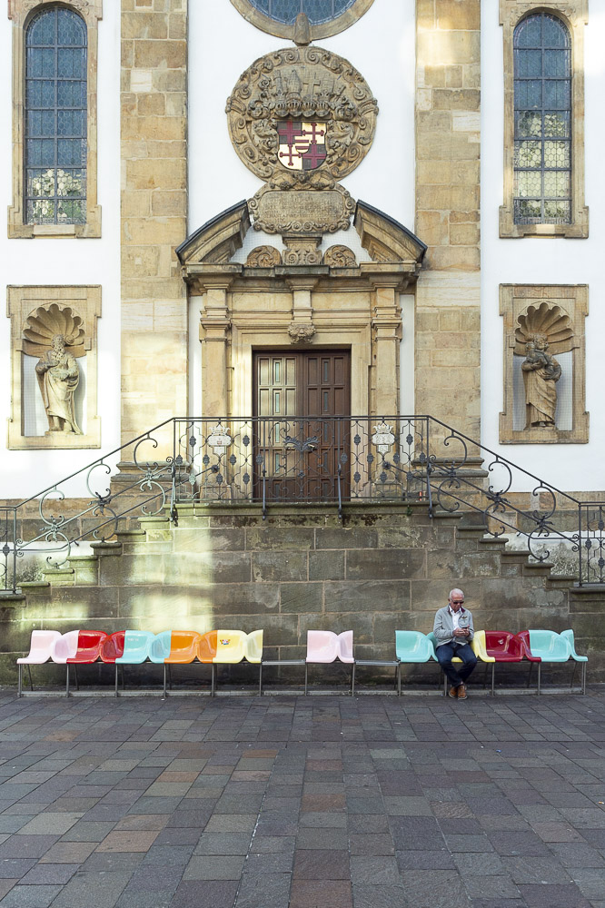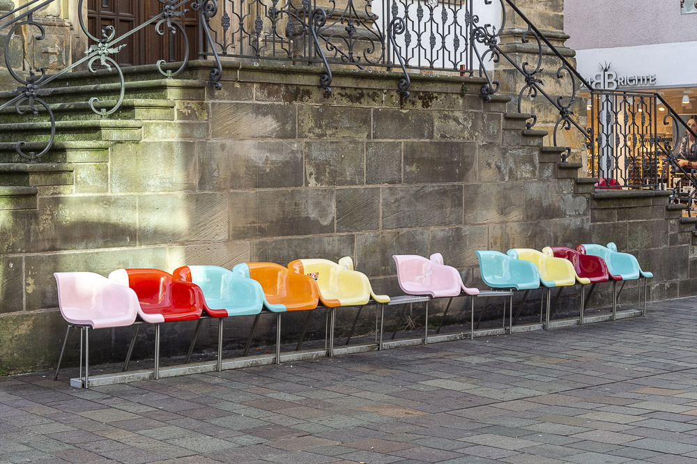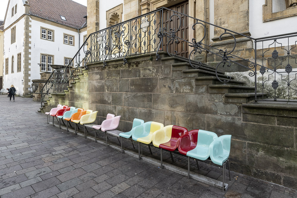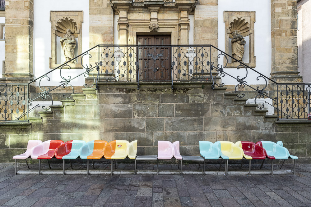 Die Skulptur erinnert an eine Reihe von Kunststoff-Schalensesseln, wie wir sie aus öffentlichen Wartebereichen, z.B. auf Flughäfen oder auch aus Arztpraxen kennen. In leuchtenden Farben, rot, gelb, orange, rosa und türkis, sind die Sitzschalen auf graue Metalltraversen montiert, die eine lange Reihe von 12 Modulen bilden. Ein Modul besteht jedoch nicht, so wie wir es gewohnt sind, aus einer Sitzschale mit Armlehnen an den Seiten, sondern die Armlehnen befinden sich in der Mitte jedes Moduls. Erst in der Reihung ergeben sich die bekannten und nutzbaren Sitzgelegenheiten. Zwei Leerstellen in der Reihe unterbrechen die Sitzreihe, lassen eines der Module isoliert dastehen und machen so deutlich, dass die Grundform nicht funktional sondern skulptural ist. An den Enden der Reihe ergeben sich „halbierte“ Stühle, die auf eine potentielle Weiterführung der Kette hinweisen, und auch farblich erscheinen alle Sitze geteilt. Tatsächlich sind die Sitzschalen auch benutzbar. Durch die Nutzung wird der Betrachter aktiver Teil der Installation, er kann das Erscheinungsbild mitgestalten, es ergibt sich ein bewegtes und lebendiges Bild, wenn die Menschen kommen und gehen und sich für eine Weile auf den bunten Sitzen vor der grauen Mauer des Franziskanerklosters niederlassen.
