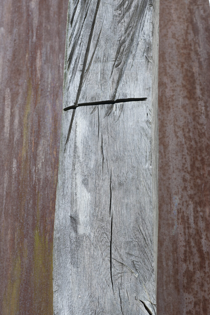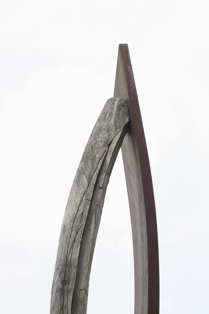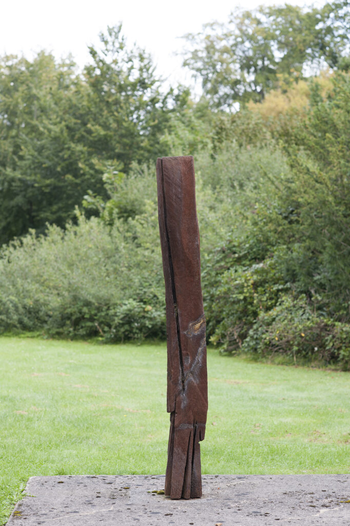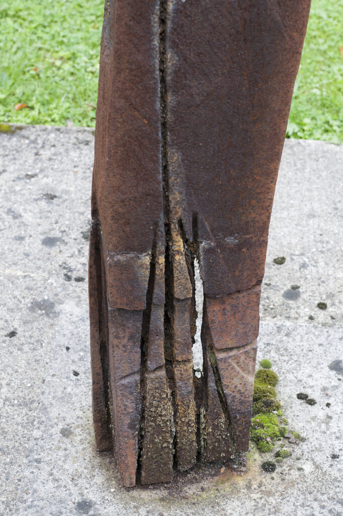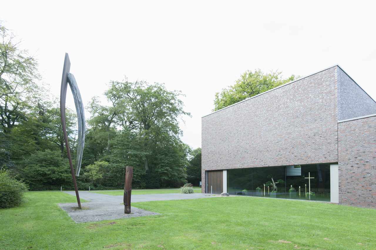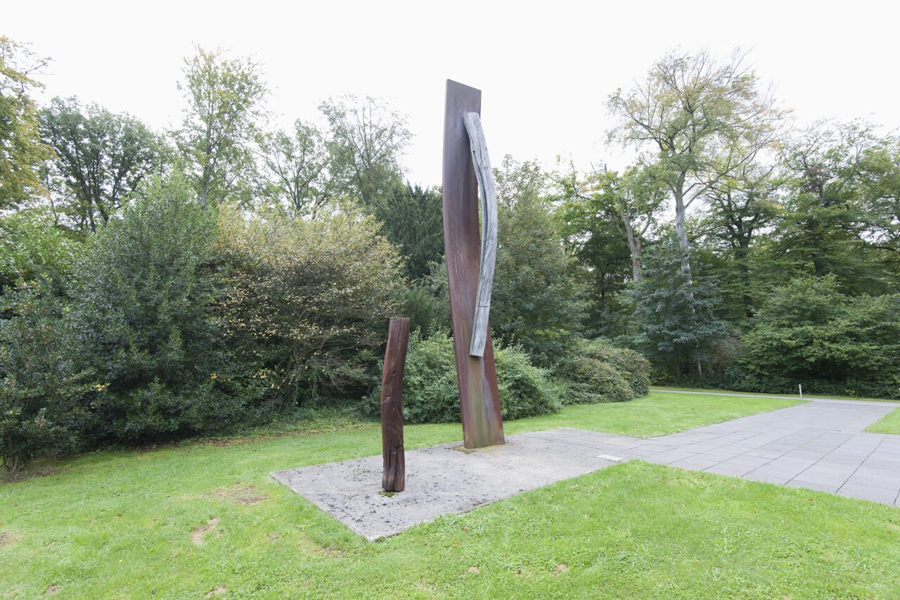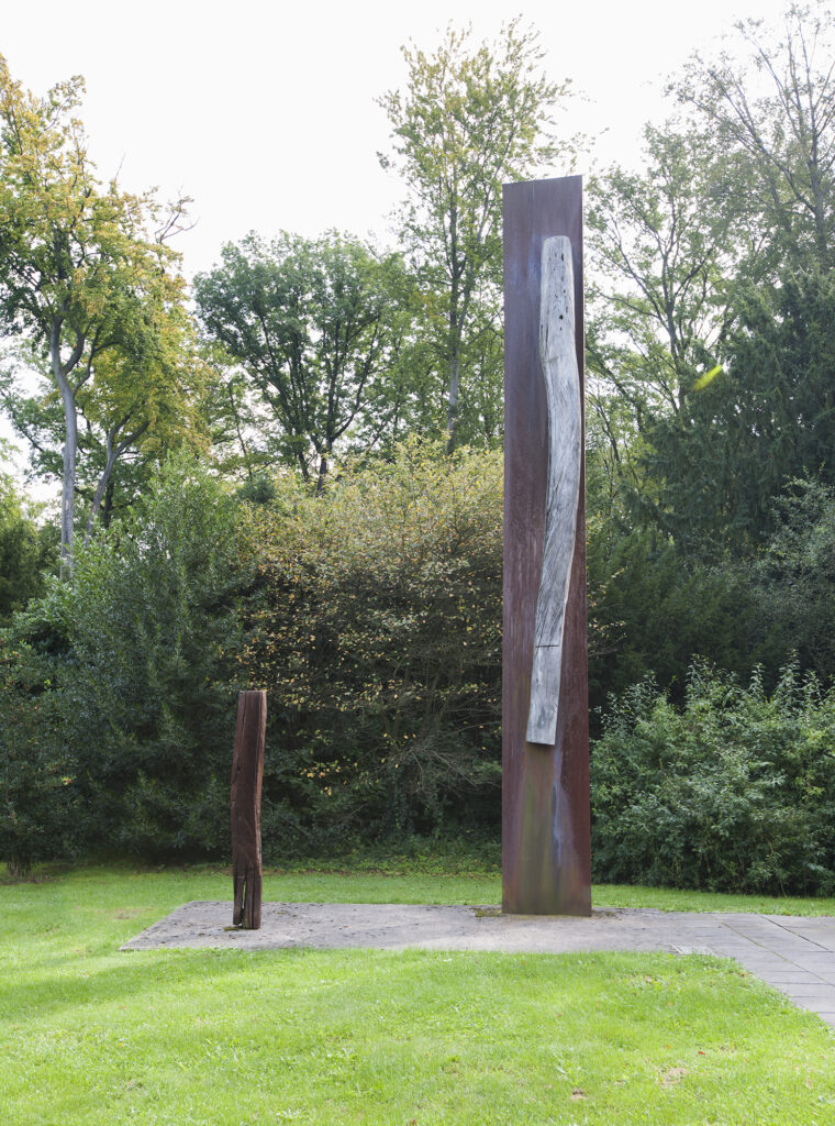 Auf dem Waldfriedhof in Duisburg ist der Bildhauer Wilhelm Lehmbruck begraben. Anlässlich der Neugestaltung des Krematoriums auf diesem Friedhof entstand 2002 die zweiteilige Skulptur „Dazwischen oder für meinen Nachbarn“ von Erwin Wortelkamp. Sie besteht aus einem gut zwei Meter hohen Eisenguss eines roh behauenen Balkens und einer im Abstand von ebenfalls zwei Metern aufgestellten, leicht in Richtung der ersten Skulptur gebogenen Eisenbramme. An dieser Bramme wurde auf etwa 1,80 Metern Höhe ein großer und massiver Holzstamm befestigt, dessen leicht gebogene Linie sich der Eisenform zuwendet, so dass hier ein Zwischenraum in Form eines spitzen Ovals entsteht. Diese Leerform ist genauso als Bestandteil der Skulptur anzusehen, wie der Abstand zwischen den beiden skulpturalen Stelen. Es bleibt dem Betrachter überlassen, welche Interpretation er dieser abstrakten, archaisch wirkenden Konstellation geben möchte: Im Kontext mit ihrem Umraum kann sie als stark abstrahierte christliche Symbolik ebenso gelesen werden, wie als Hinweis auf die Bedeutsamkeit von Leerstellen in künstlerischen Darstellungen oder im Leben.
