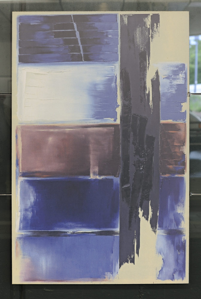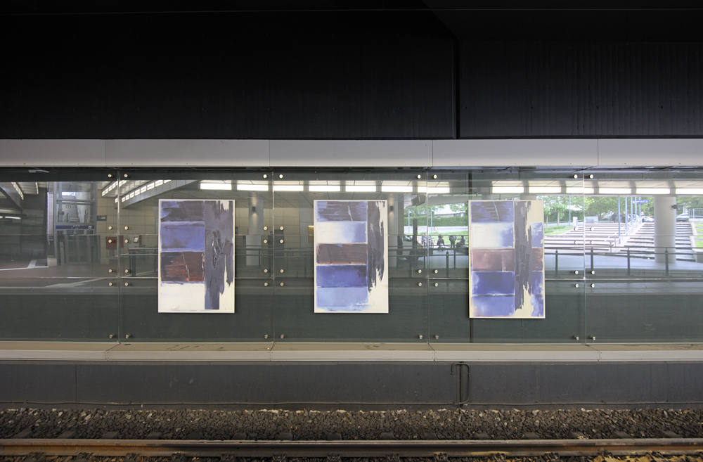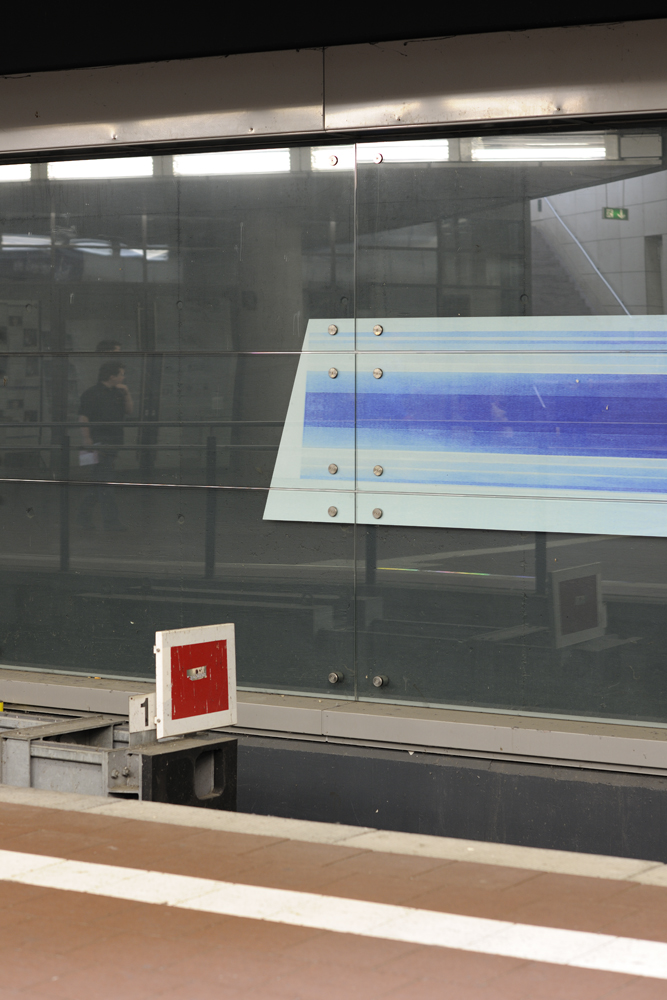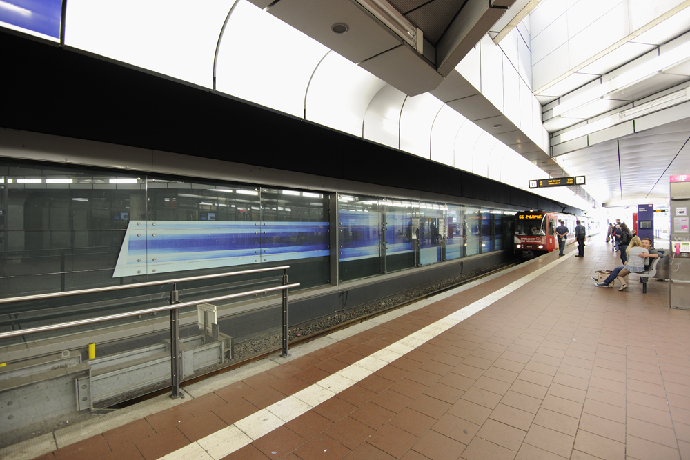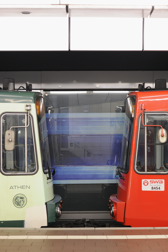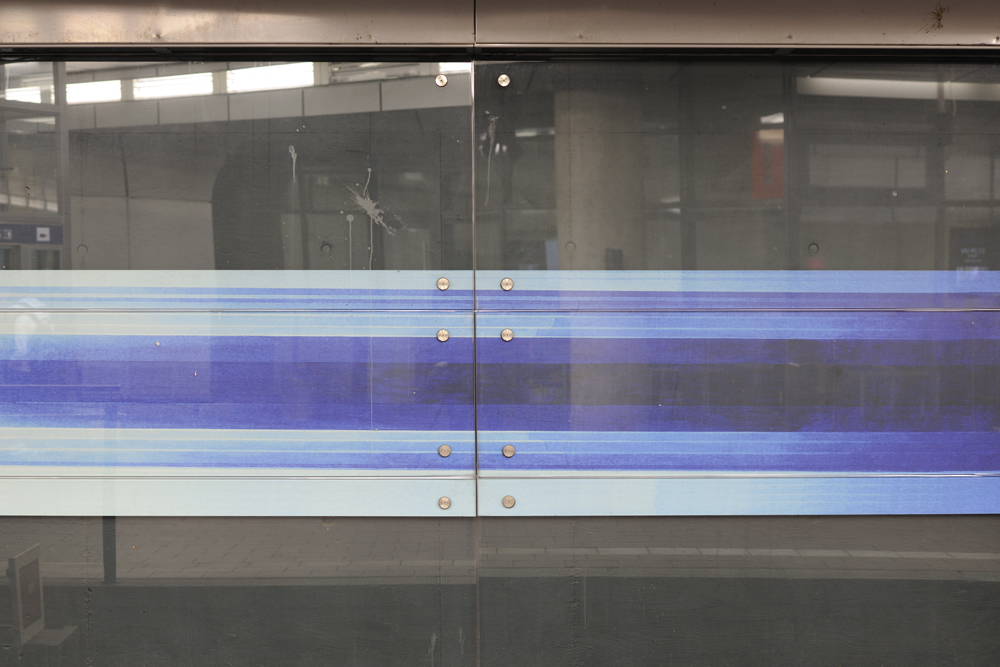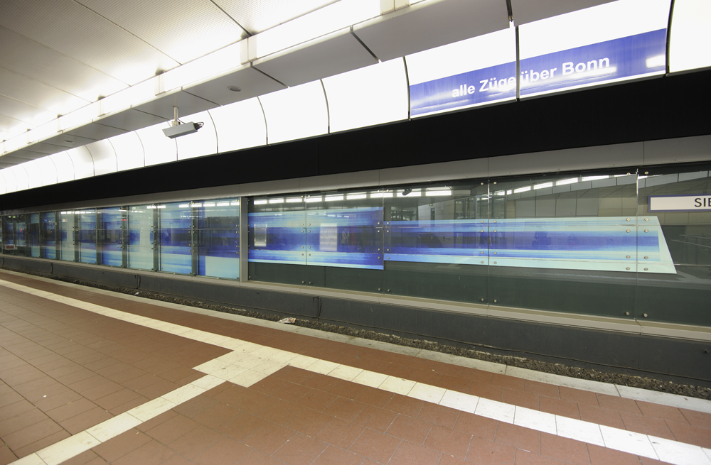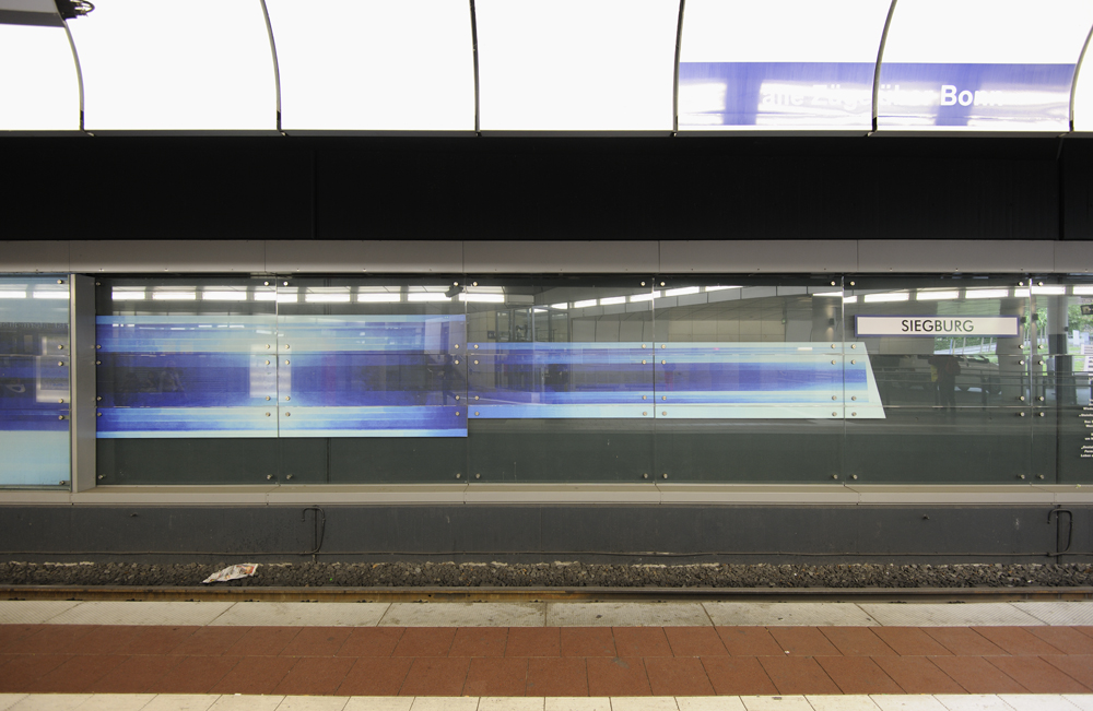 Der vielseitige Freiburger Künstler Hans-Günther van Look war sowohl Bildhauer als auch Maler, besonders widmete er sich jedoch der Gestaltung von Glasfenstern, wie sie zum Beispiel im Freiburger Münster zu sehen sind. Im Siegburger Bahnhof gestaltete er die Wand hinter den Bahngleisen ebenfalls mit Malerei hinter Glas. Die Reihe beginnt mit drei hochformatigen abstrakten Gemälden in Blautönen, setzt sich in mehreren Panelen in streifigem Blau fort, um dann in schrittweise schmaler werdenden Streifen auszulaufen.