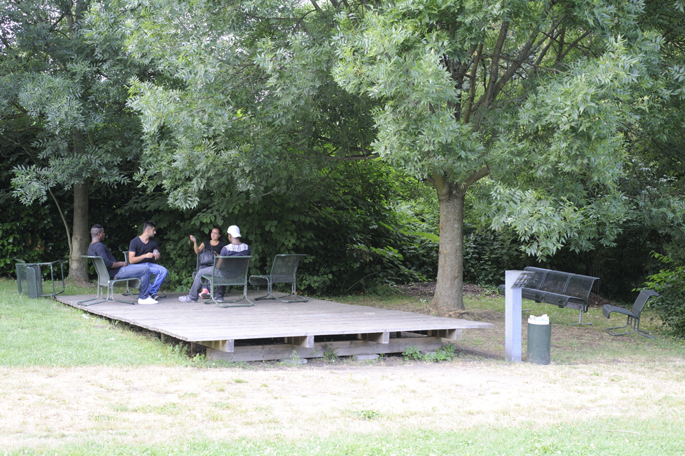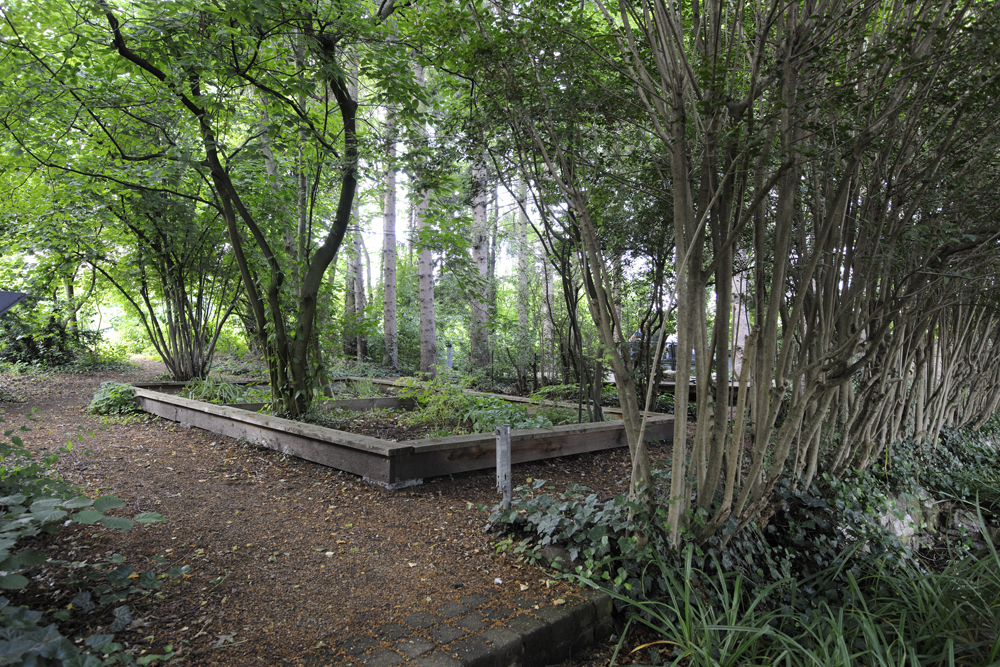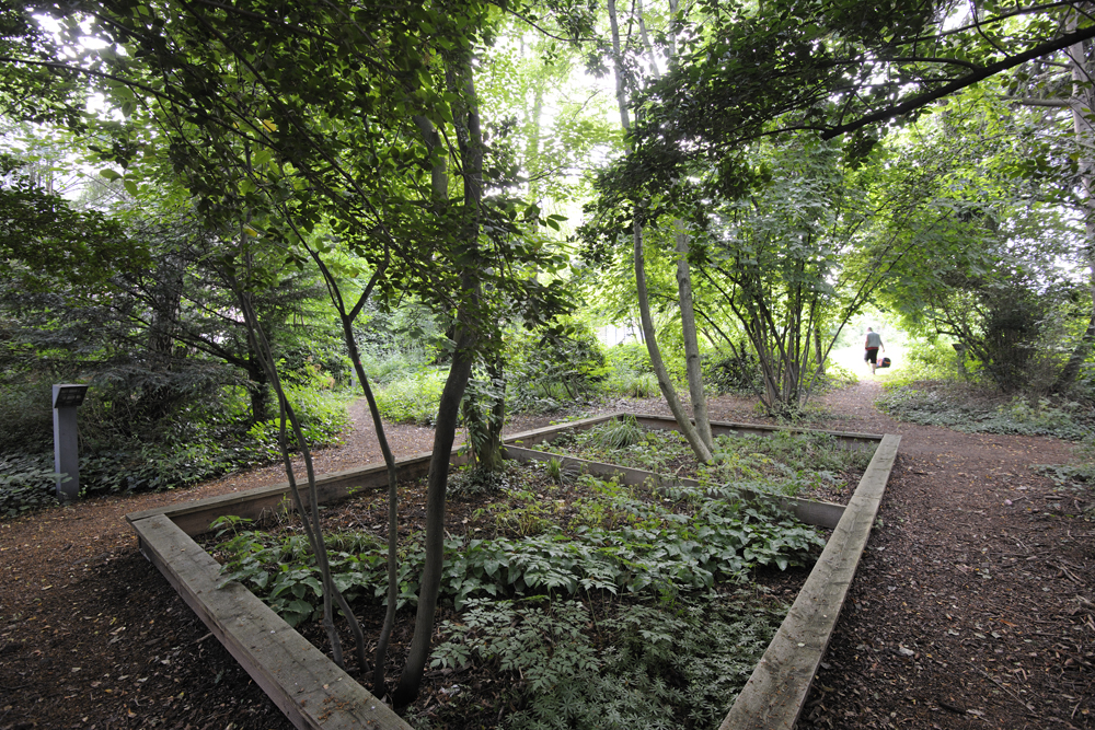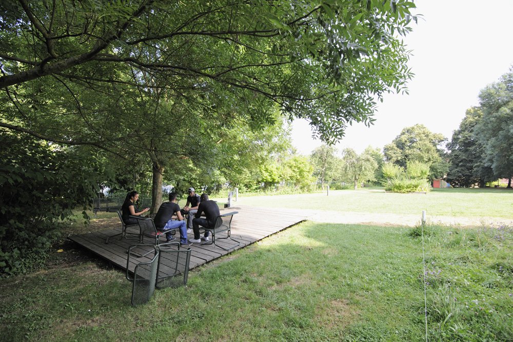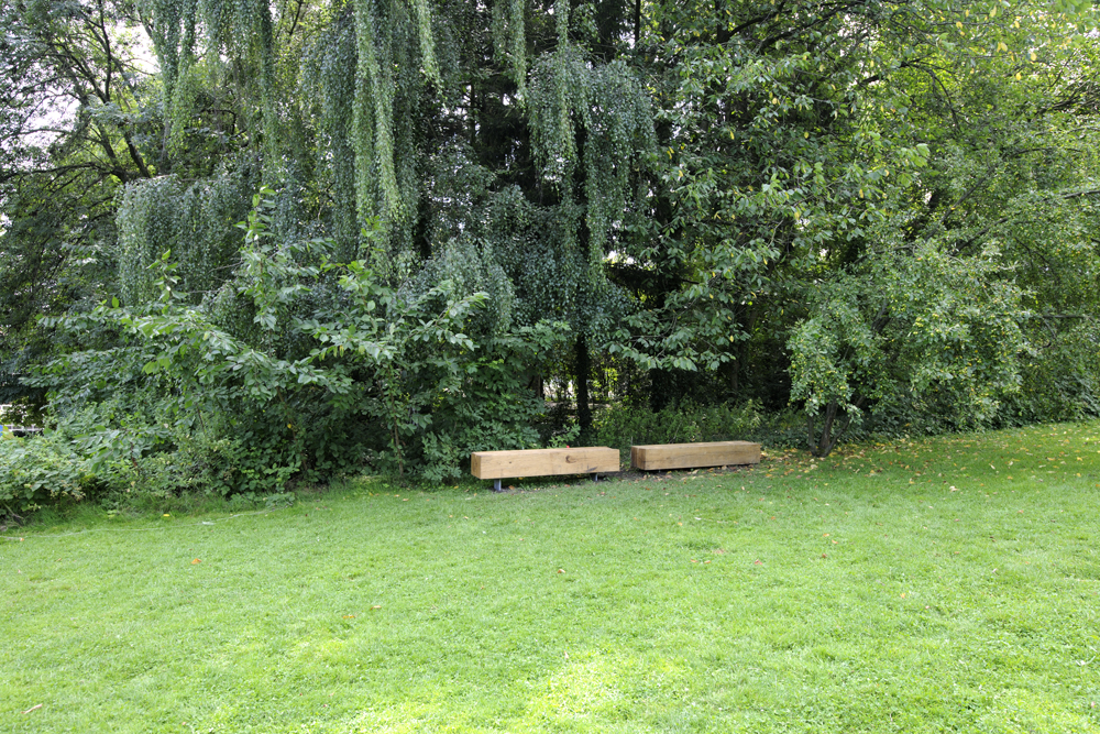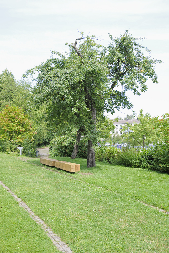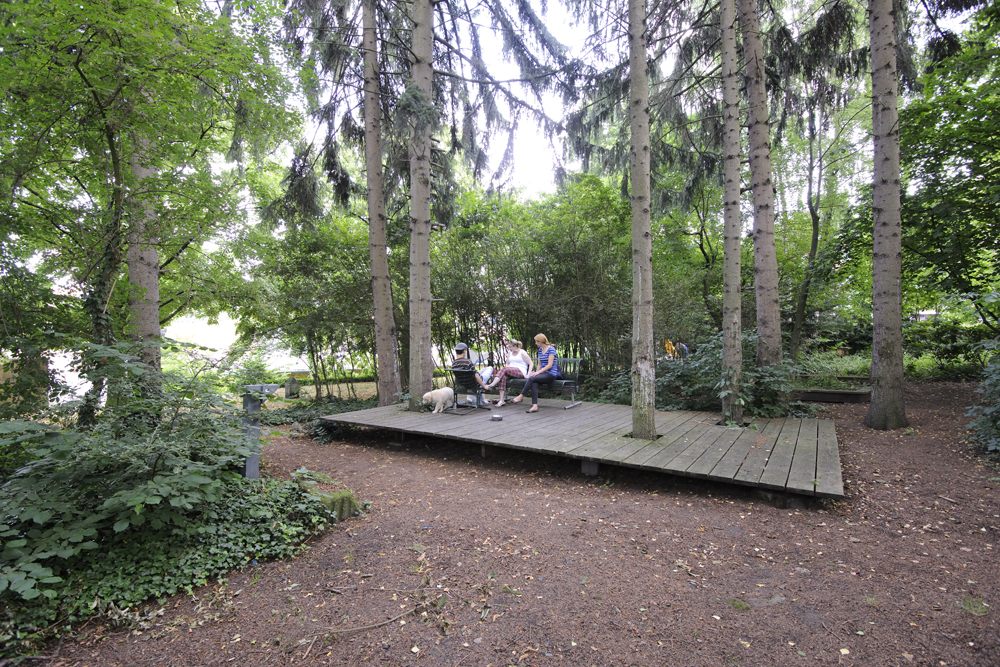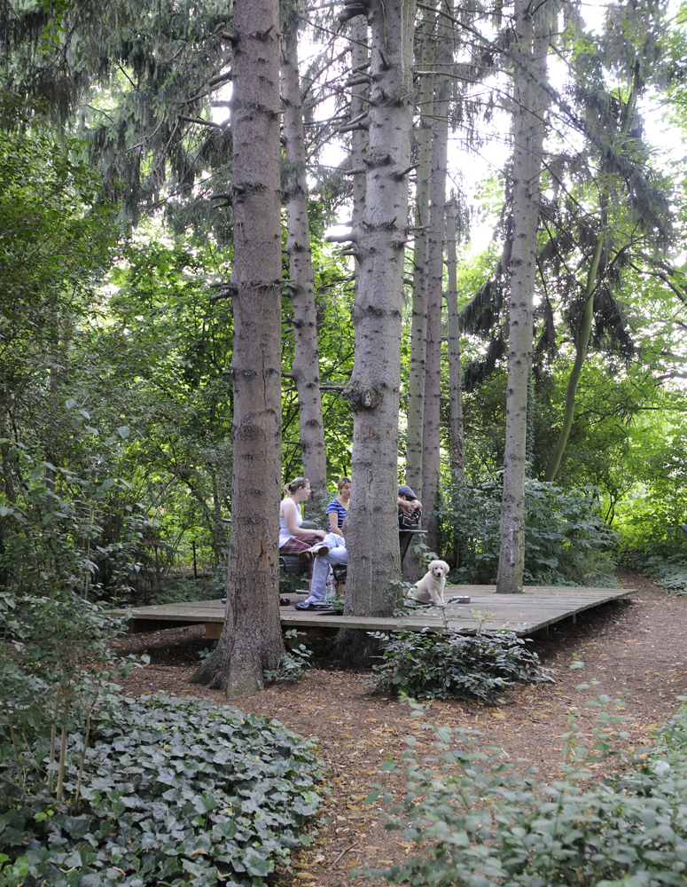 1. Gartenaktion Juni 2011: Zwei neue Plattformen entstanden, eine im schattigen Wäldchen und eine im Sonnenlicht auf offener Wiese. Die neuen Podeste wurden gezielt in die vorhandene Vegetation eingepasst. Sie scheinen über dem Boden zu schweben, akzentuieren etwa eine Bodensenke oder begradigen optisch eine abschüssige Stelle; sie rahmen einzelne Baumstämme oder sind eingespannt zwischen zwei Bäumen. Damit bilden sie eine Art Echo auf die Natur, so dass der jeweilige Ort in seiner Eigenart vollkommen neu wahrgenommen wird. Die neuen Plattformen sind Treffpunkt, Ruhezone und Bühne in einem.