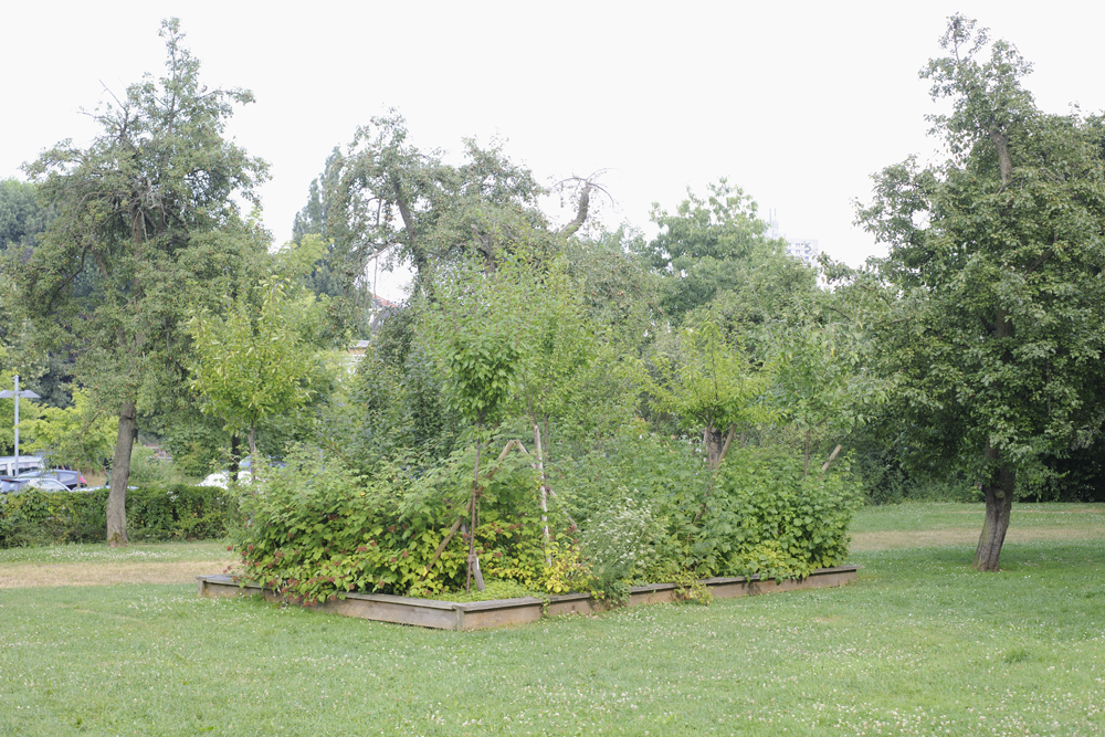 2. Gartenaktion November 2011: Neben dem gezielt strukturierenden herbstlichen Rückschnitt der Vegetation wurden zwei Parkzellen angelegt. „Petite Nature No 1“ versammelt dicht nebeneinander eine Vielzahl unterschiedlicher Obstbäume, kombiniert mit Himbeersträuchern. Dieser „Bauminsel“ gegenüber steht „Petite Nature No 2“ am Waldrand, die mit Schattengewächsen bepflanzt ist. Nach jedem Arbeitsschritt fertigen atelier le balto Zeichnungen der Entwicklung an, besprechen die Konzeption, überprüfen die Planung und passen sie gegebenenfalls neu an.