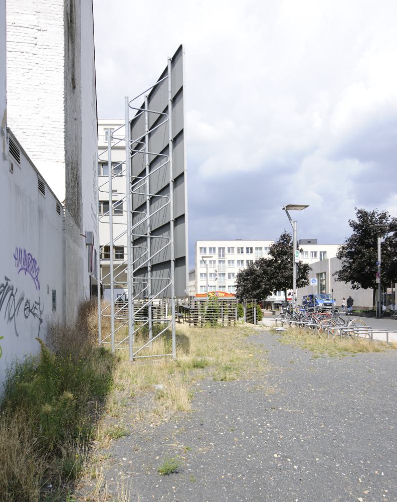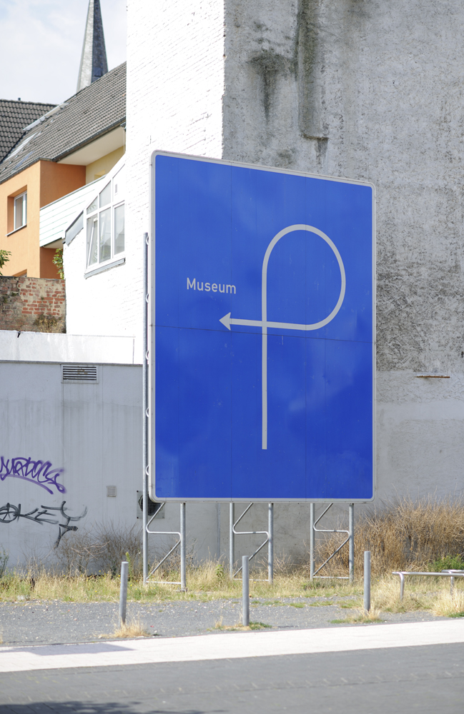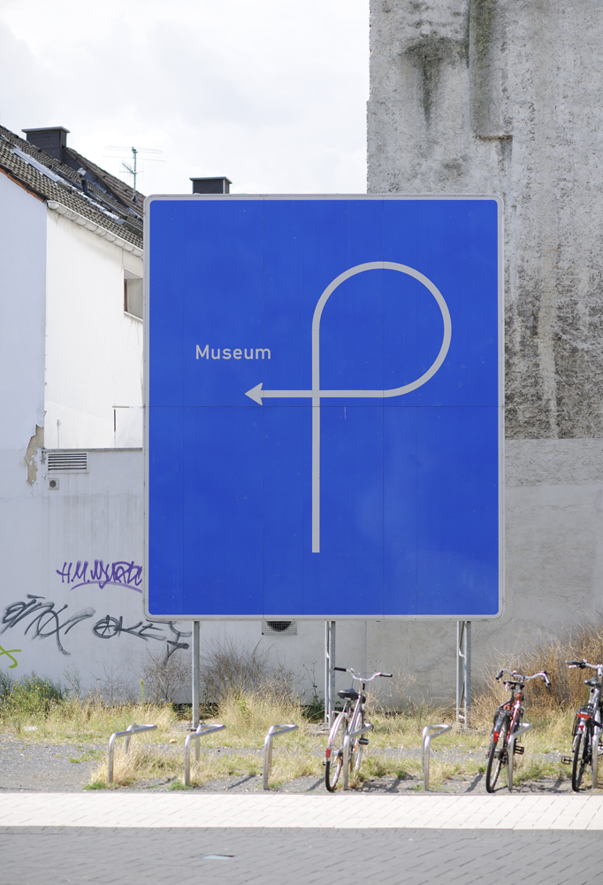 Thomas Rentmeister verwendet in seiner Arbeit bevorzugt Materialien wie Nutella oder Penaten-Creme, die für Werke im öffentlichen Raum kaum geeignet sein dürften. Dennoch bleibt er auch hier seinem experimentellen Ansatz treu, in dem er Gebrauchsgegenstände verfremdet und in den Kunstkontext überführt. Für das Museum Abteiberg entwarf er ein originalgetreues Autobahnschild, das eine verschlungene Strecke zum Museum auszuschildern scheint. Schon die Präsenz einer blauen Autobahnbeschilderung im innerstädtischen Bereich irritiert, hinzu kommt die Absurdität der Wegführung.