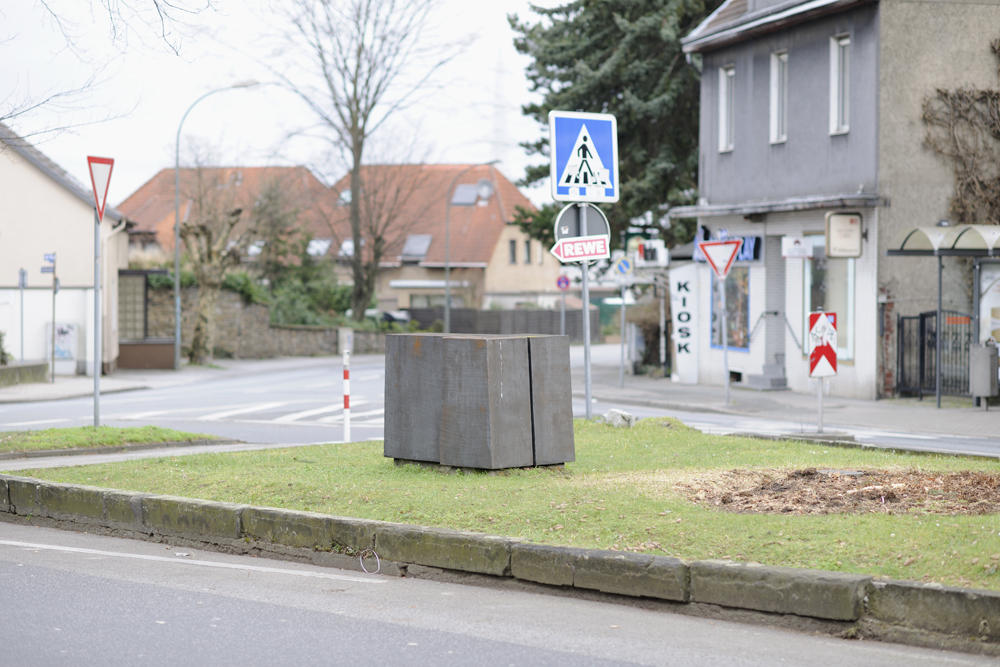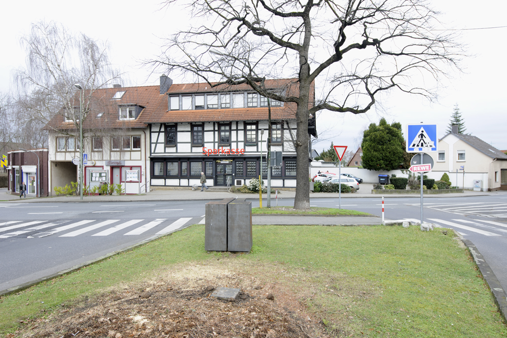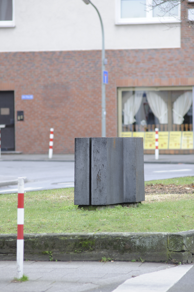 Trotz der einfachen Grundformen sind diese Körper nicht streng geometrisch, sondern leicht unregelmäßig, wie auch die Aufstellung etwas schräg zum Straßenverlauf ausgerichtet ist. Auch die in vielfältigen Farbtönen changierende Patina des Stahls trägt zur Wirkung der Skulptur bei, deren wechselnde Licht- und Schattenwirkungen sich dem konzentrierten Betrachter erschließen.