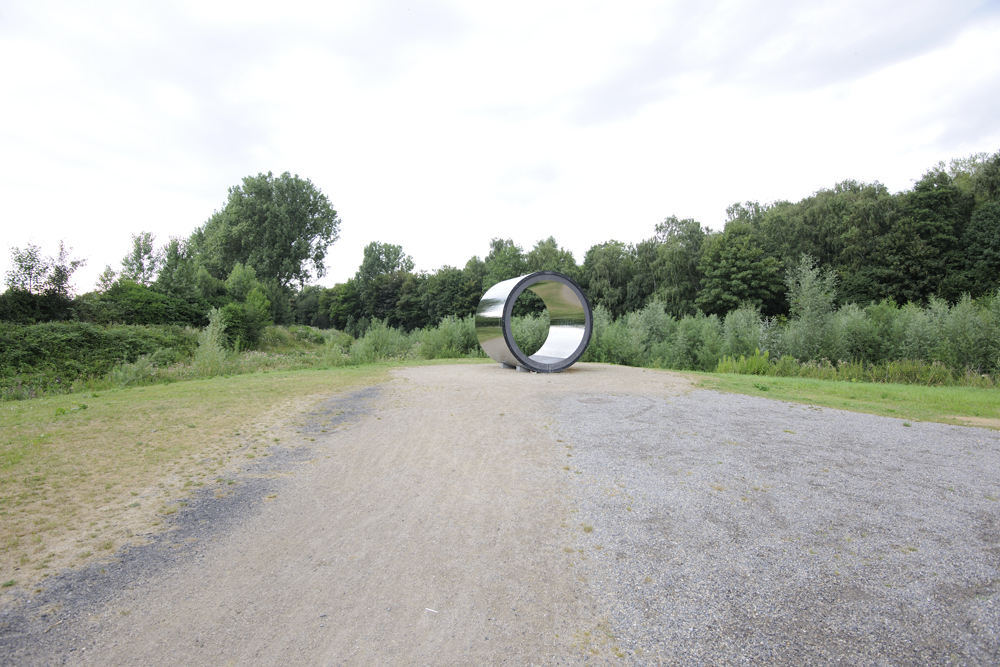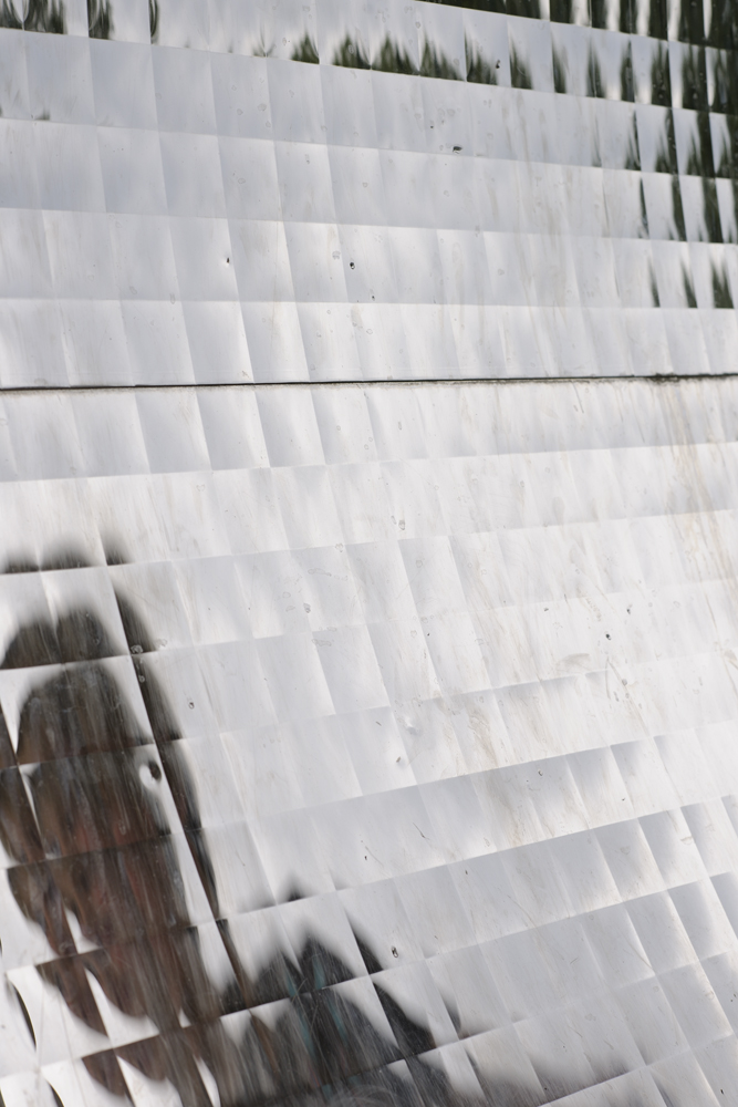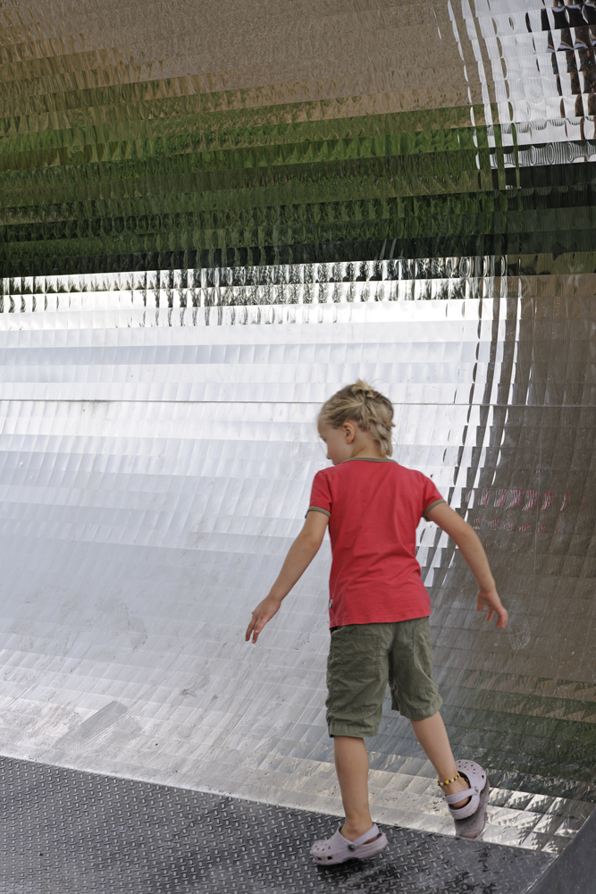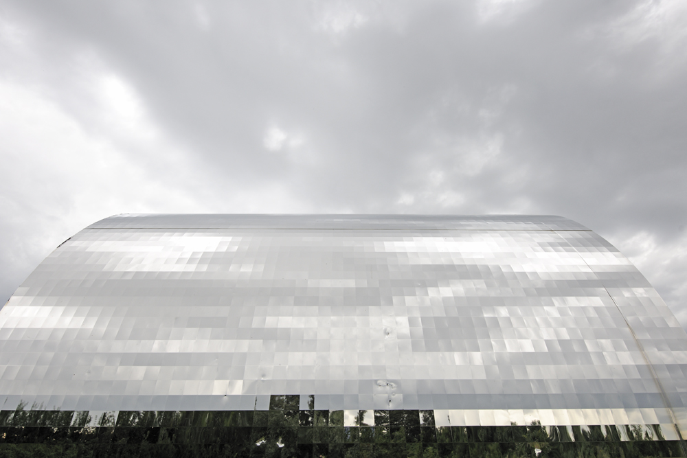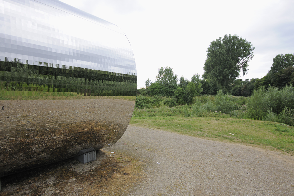 Innen und außen überzogen mit einer Haut aus reflektierender, in quadratische Segmente unterteilter Metallfolie, verwandelt sie die Umgebung und den sich spiegelnden Betrachter in ein grob gepixeltes Foto. Es entstehen überraschende Formenspiele einer gebrochenen, sich in stetem Wandel befindenden Landschaft.