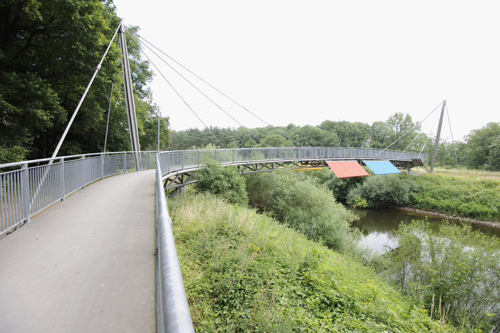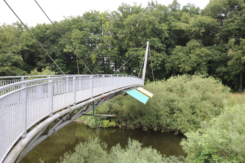 Die Brücke, die Otmar Sattel zum Schauplatz seiner Installation macht, liegt an einer traditionell viel genutzten Trasse, die die Emsdettener Ortsteile Sinningen und Isendorf verbindet. Auch der Emsradweg führt hier entlang, so dass diese Strecke bei Einheimischen und Touristen beliebt ist. Zu Spaziergängern und Fahrradfahrern gesellen sich am Wochenende die Kanufahrer auf der Ems hinzu. In seiner Installation greift Otmar Sattel unterschiedliche Bewegungsrichtungen auf – die des Flusses und die der Brücke.