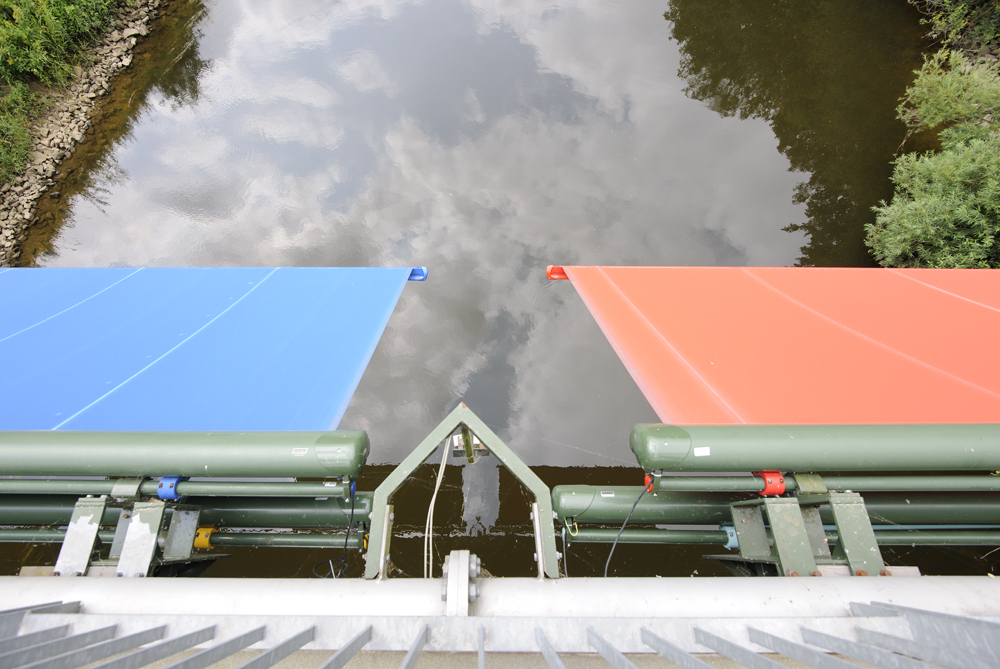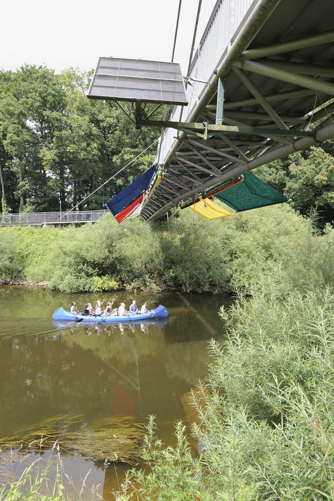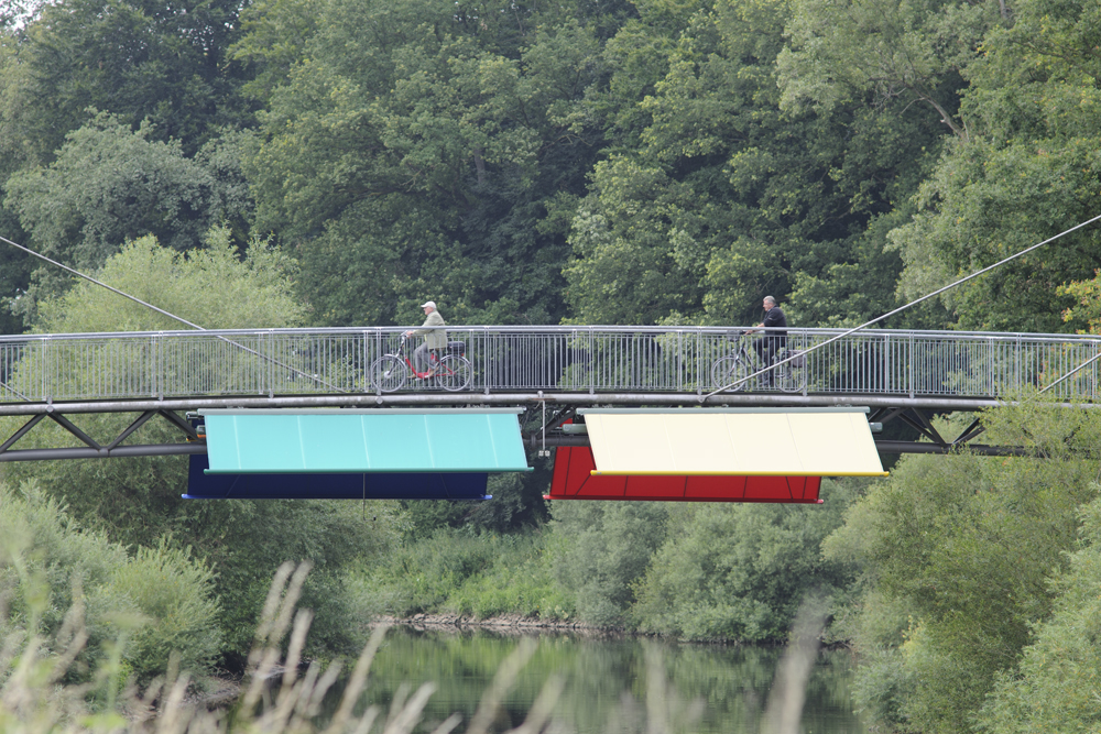 Wird die Brücke überquert oder fährt ein Kanu auf der Ems unter der Brücke hindurch, werden die hier angebrachten Markisen ausgefahren. Der Blick herab oder hinauf wird auf die monochromen, sich bewegenden Farbfelder gelenkt. Otmar Sattel spielt hier nicht nur mit dem industriell vorgefertigten Material der Markisen, die, eigentlich als Sonnenschutz produziert, hier an ungewöhnlicher, ja absurd erscheinender Stelle montiert sind. Er spielt auch mit den Methoden der Farbfeldmalerei seit Mondrian, die hier zu einer bewegten Choreografie umgestaltet wird.
