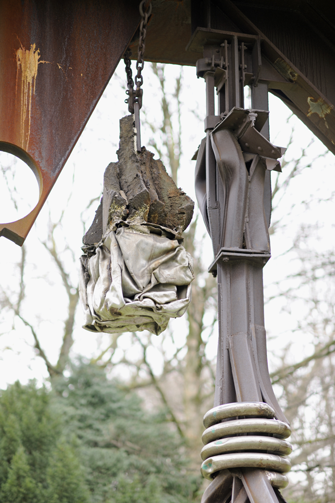 Aus Stahl und Edelstahl, kombiniert mit Fundstücken aus der Produktion der Eisen- und Stahlkonstruktion schweißte der Künstler eine schwere, nur durch ein aufwendiges Fundament in der Balance gehaltene Rampe, die durch verschiedene Einzelelemente, Streben und Stützen vervollständigt wird. Als optische Gegengewichte fungieren zwei kleinere Objekte in einigem Abstand zu dieser Konstruktion.