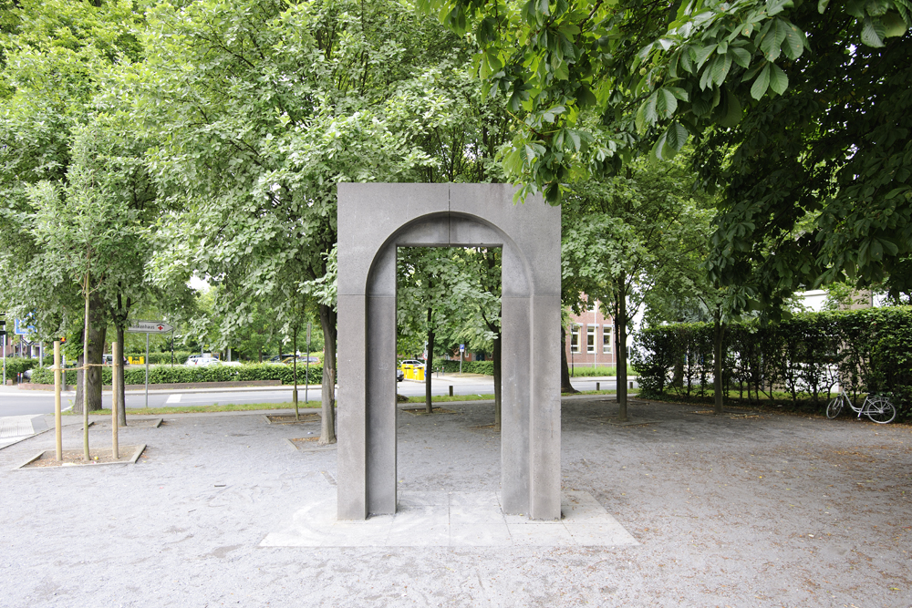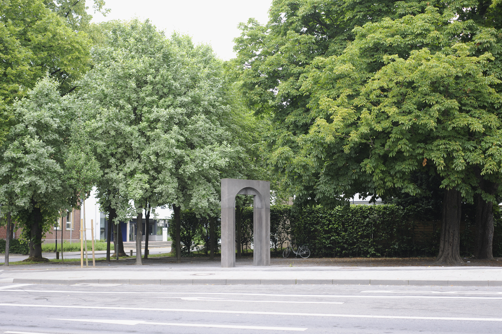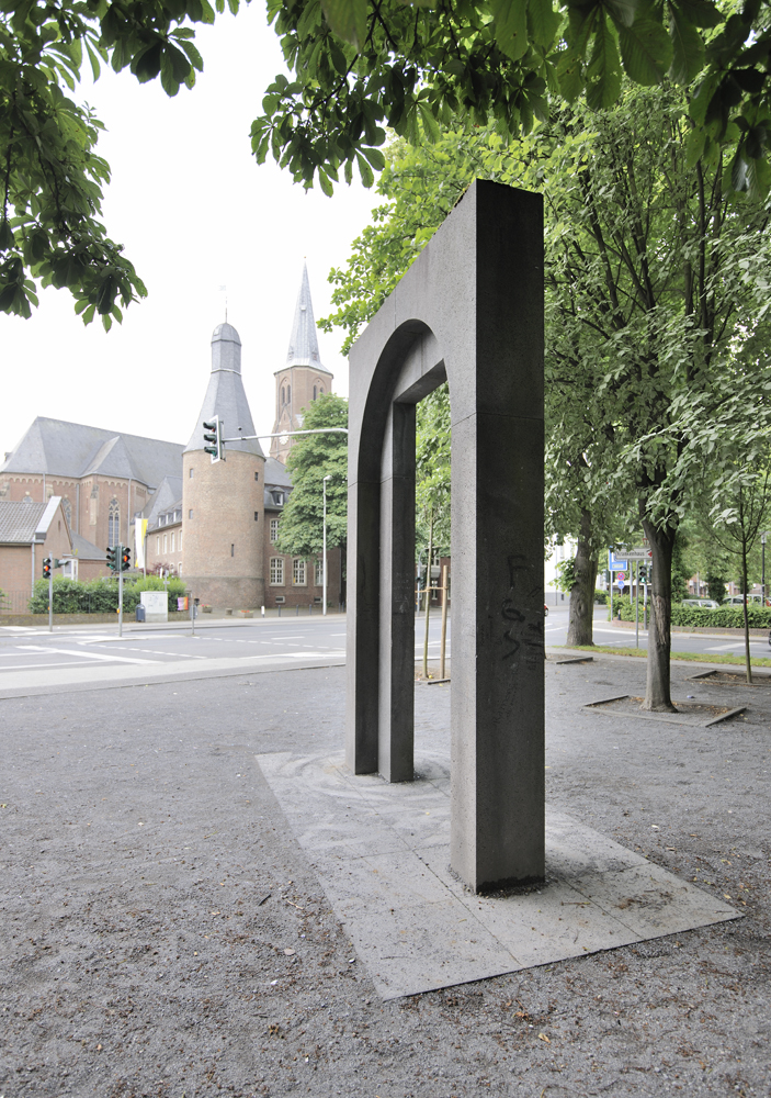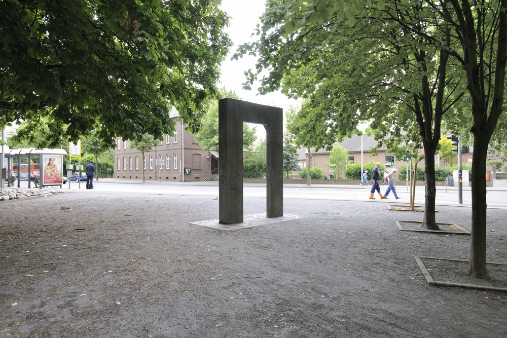 Auch die in Grevenbroich stehende Skulptur greift ein architektonisches Motiv auf, denn sie stellt eine rechteckige Türöffnung innerhalb eines rundbogigen Portals dar. Diese Ausgangssituation wurde vom Künstler so weit auf ihre geometrische Grundlage reduziert, dass sie in dieser Skulptur als rein abstrakte, zeitlose Form bestehen kann.