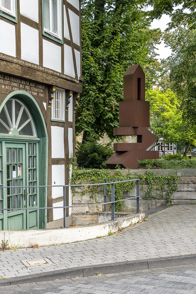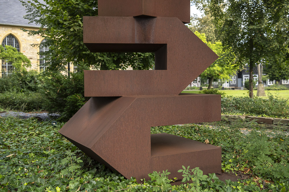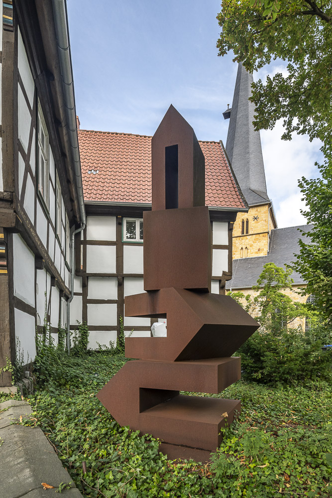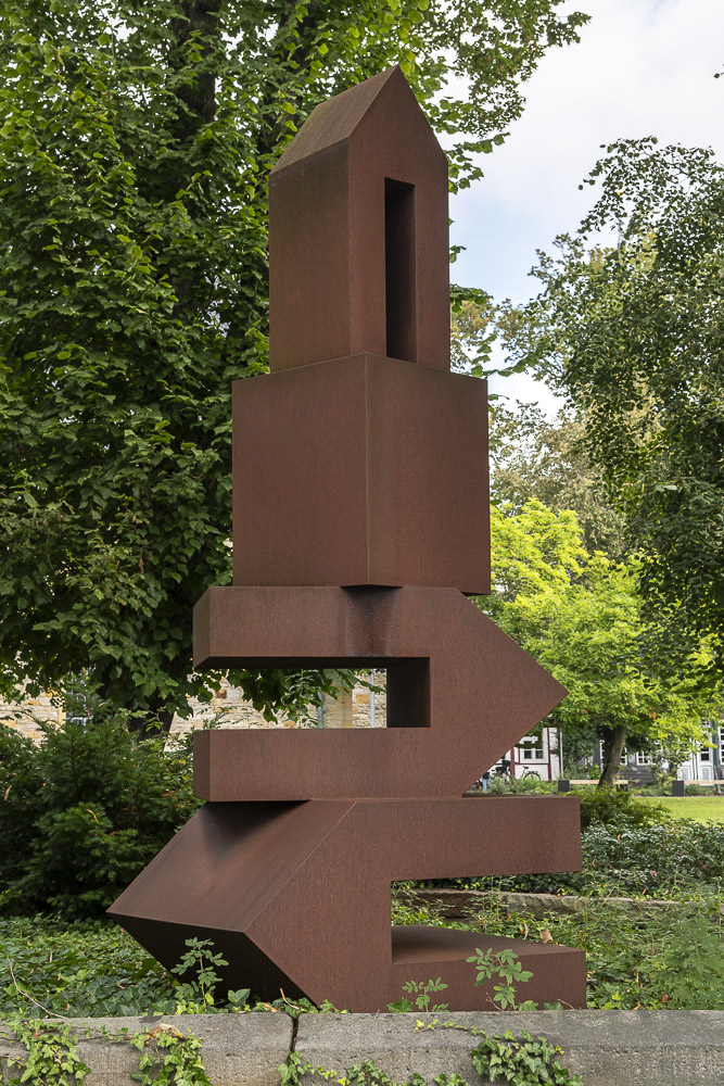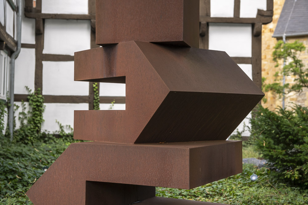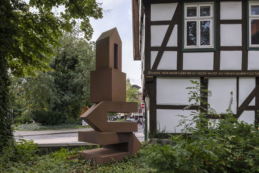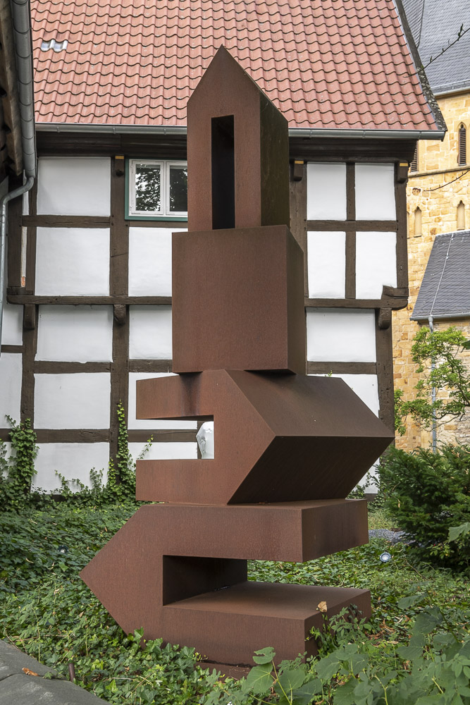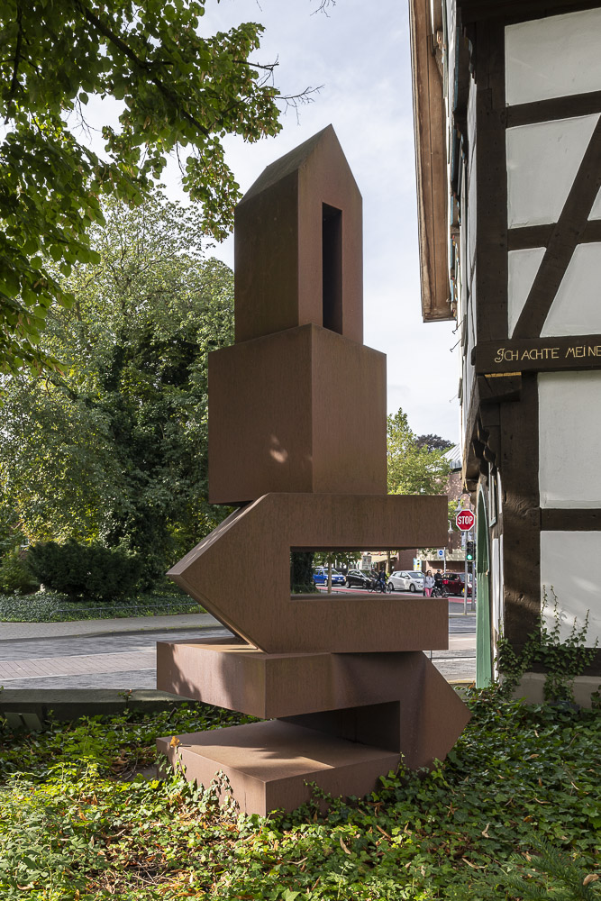 Die Hausform auf ihre Grundelemente – hier Wand, Giebel, Dachfläche und Türöffnung – reduziert, ist typisch für die Stahlplastiken des Bildhauers Werner Pokorny. Auf der Seite liegend, übereinandergestapelt und mit einem aufrecht stehenden Haus als „Turmspitze“ bekrönt, schuf er verschiedene Variationen des „Turms“. Die Version in Gütersloh beinhaltet über zwei liegenden Häusern noch einen geschlossenen Würfel, auf dem dann das nach oben abschließende, wie ein Pfeil nach oben weisende Haus steht. Gefertigt ist die Skulptur aus Corten-Stahl, dessen rostige Patina nicht nur für einen Witterungsschutz, sondern auch für eine warme, ziegelähnliche Farbigkeit sorgt. Besonders ist hier der historische Kontext, in dem das Werk sich verortet, auch wenn der Künstler diesen erst im Nachhinein erfuhr: „Wenn man die Geschichte der in der Reichskristallnacht abgebrannten Häuser jüdischer Bewohner hier in der Kirchstraße zugrunde legt, hat das Kunstwerk eine noch tiefere Bedeutung“, beschrieb diese historische Dimension Reiner Kuhn, Vorsitzender des Vereins zur Förderung plastischer Kunst in Stadt und Kreis Gütersloh e. V., der für die Aufstellung vor dem Gebäude des Kunstvereins sorgte. So kann die ihrem Wesen nach autonome Skulptur auch als Erinnerungszeichen an die zerstörten Häuser gelesen werden.