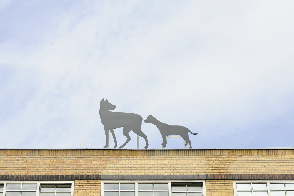 Die scherenschnittartige Darstellung zweier sich beschnüffelnder Hunde auf der vorderen Dachkante des Ludwig Forums sorgt trotz ihres durchaus alltäglichen Motivs wegen des ungewöhnlichen Aufstellungsortes für Irritation.