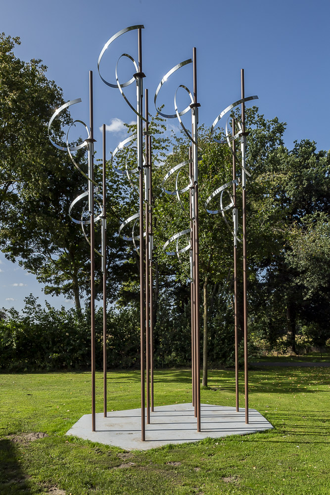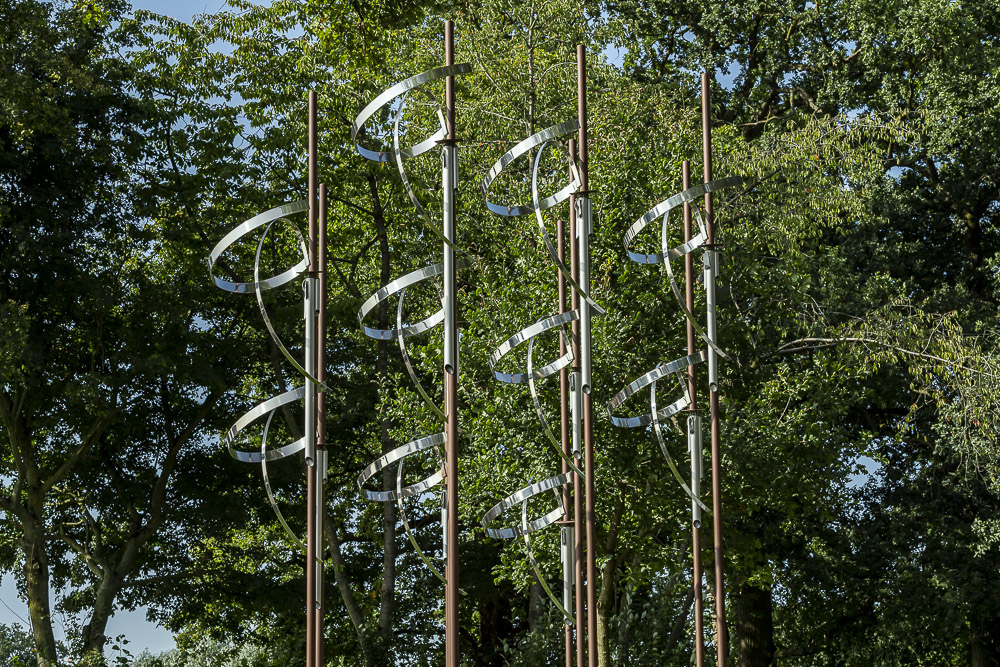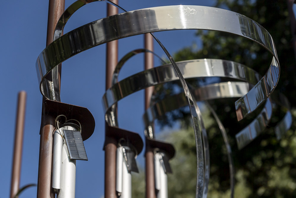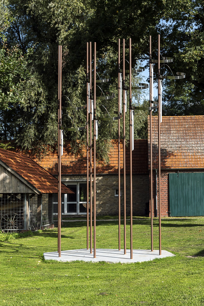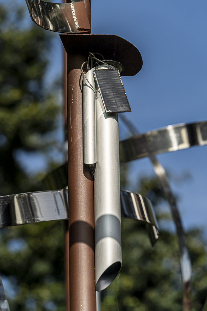 Das „Wäldchen“ ist eine Klangskulptur, deren Melodiefolgen durch Sonnenenergie erzeugt werden. Die zehn schlanken Stäbe tragen in ihrem oberen Drittel jeweils drei verschiedene Elemente: röhrenförmige Resonanzkörper, geschwungene Edelstahlbögen sowie ein kleines Solarmodul. Jedes der Module nimmt Sonnenenergie auf und verwandelt diese direkt in harmonisch aufeinander abgestimmte Töne. Abhängig von der Intensität der Sonneneinstrahlung entsteht so eine kleine, immer wieder neue Melodie. Bei Sonnenschein ist sie rhythmisch und schnell, bei Bewölkung eher ruhig und zurückhaltend. Nachts, wenn es dunkel ist, schweigt auch das Kunstwerk.