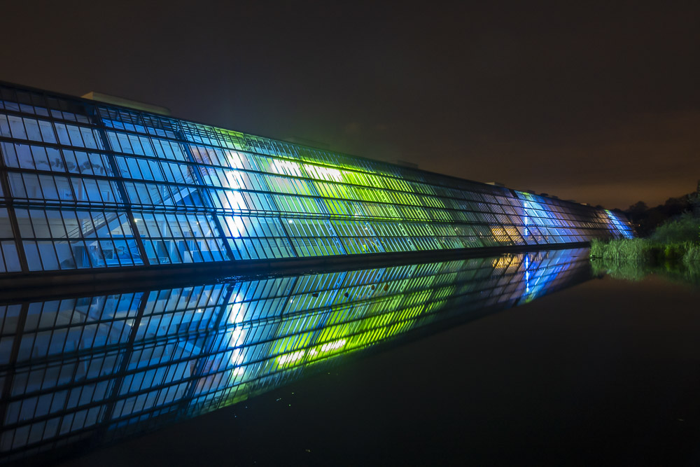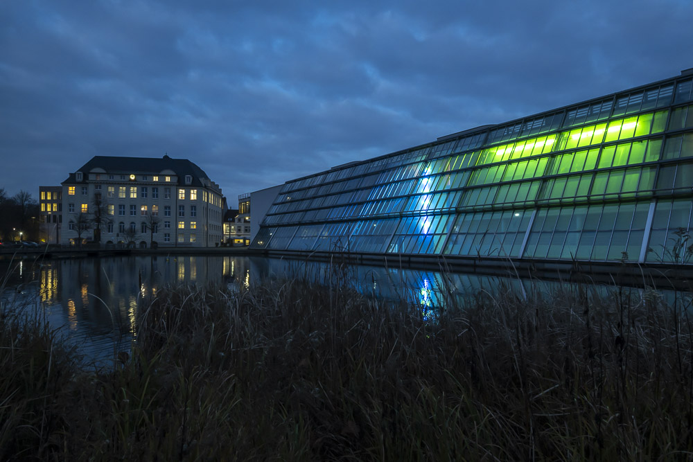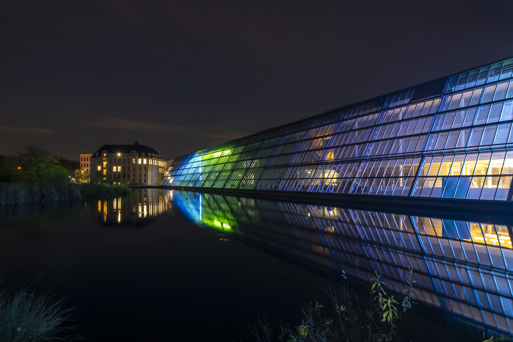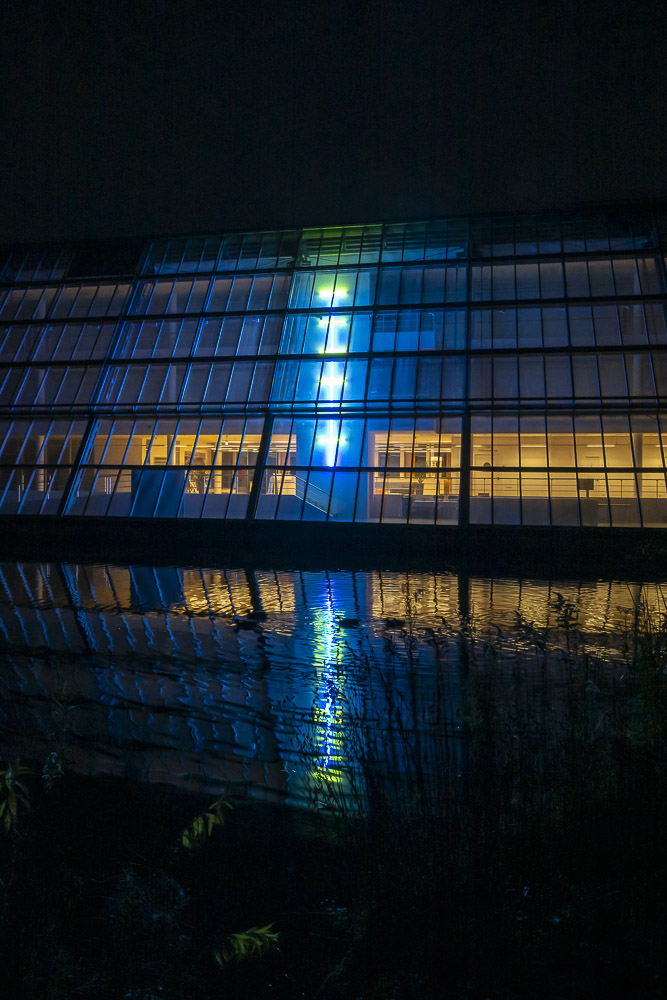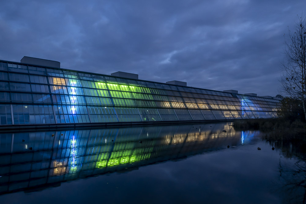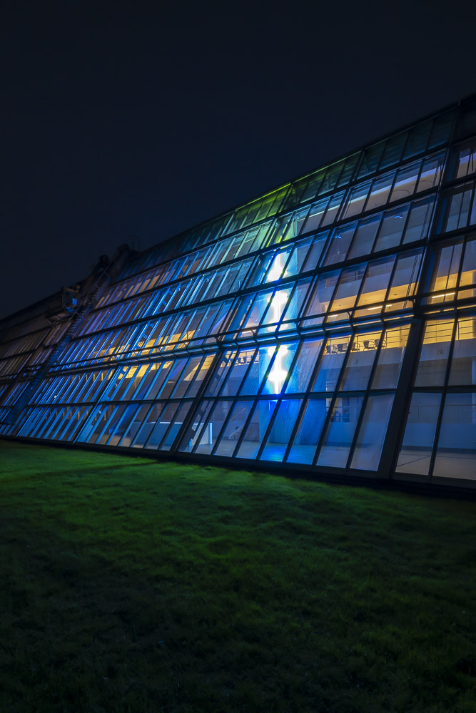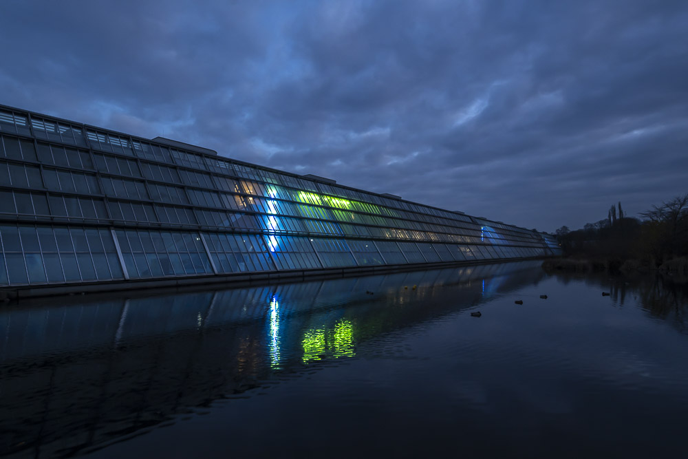 Auf dem Gelände des ehemaligen Thyssen-Gussstahlwerks und der stillgelegten Zeche Rheinelbe entstand in den 1990er-Jahren der Wissenschaftspark mit seiner markanten Glasfassade zum Park hin. Die 300 Meter lange Arkade erschließt im Inneren mit einer öffentlichen Wandelhalle den gesamten Baukomplex. Ihre transparente Hülle wird nach Einbruch der Dunkelheit vollständig in blaues, grünes und gelbes Licht getaucht. Die Installation des US-amerikanischen Künstlers Dan Flavin erzeugt dieses innen und außen wahrnehmbare Lichterlebnis. Im Inneren des Gebäudes wurden dazu drei »Bäume« aus handelsüblichen Neonröhren mit jeweils vertikalem blauen Stamm und dazu rechtwinklig angeordneten gelben Zweigen an den Aufzugschächten angebracht. Das Licht flutet durch den Innenraum und setzt sich durch die gläserne Front nach draußen fort, wo es sich auf der angrenzenden glatten Wasserfläche spiegelt.